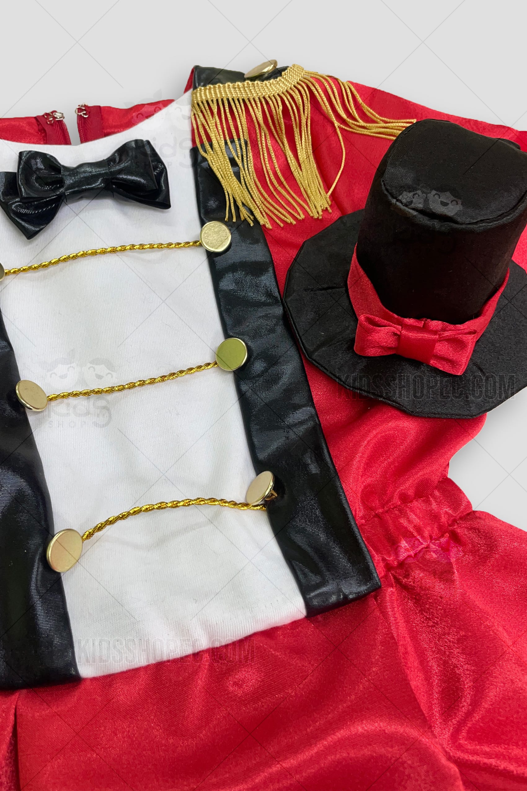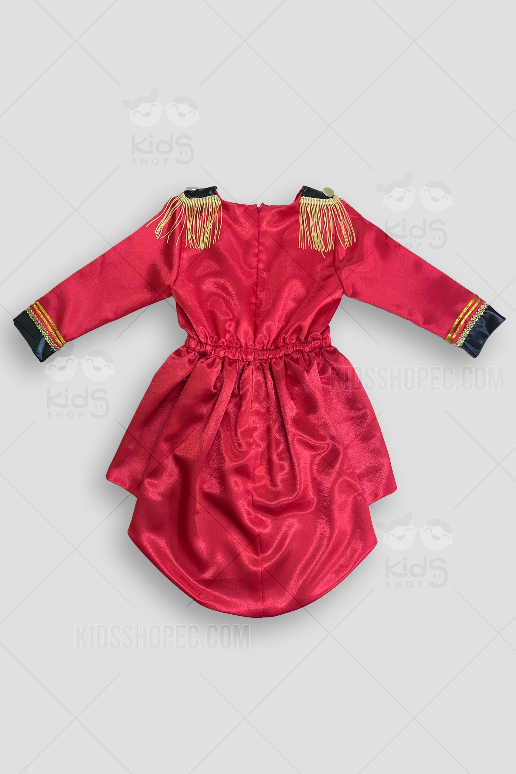 Este es un espectacular disfraz de Director de Circo para niña, perfecto para convertir a tu pequeño en la estrella del espectáculo. El traje es un vibrante frac en rojo satinado, con una elegante cola negra que le da el toque dramático. El diseño frontal incluye detalles en blanco y dorado que simulan un chaleco y botones, así como un lazo negro en el cuello. Los hombros están adornados con flecos dorados, replicando la vestimenta clásica del ringmaster. El conjunto se completa con el imprescindible sombrero de copa negro, haciendo de este un atuendo ideal para carnavales, fiestas temáticas de circo o funciones escolares.