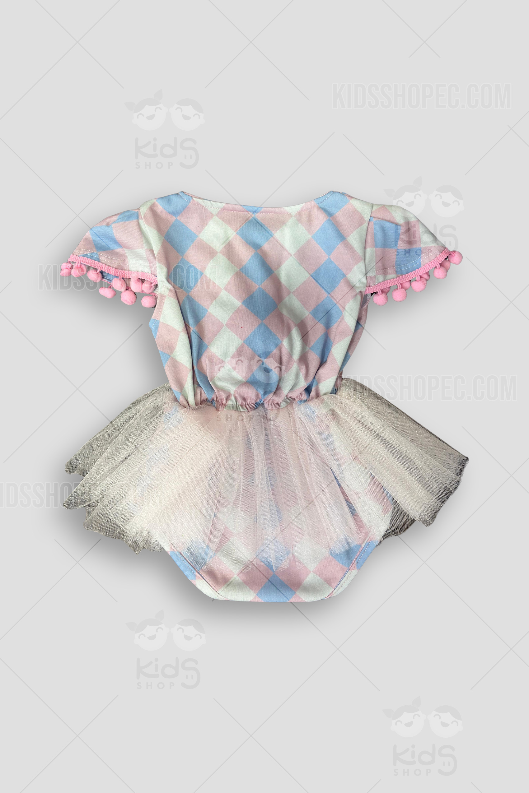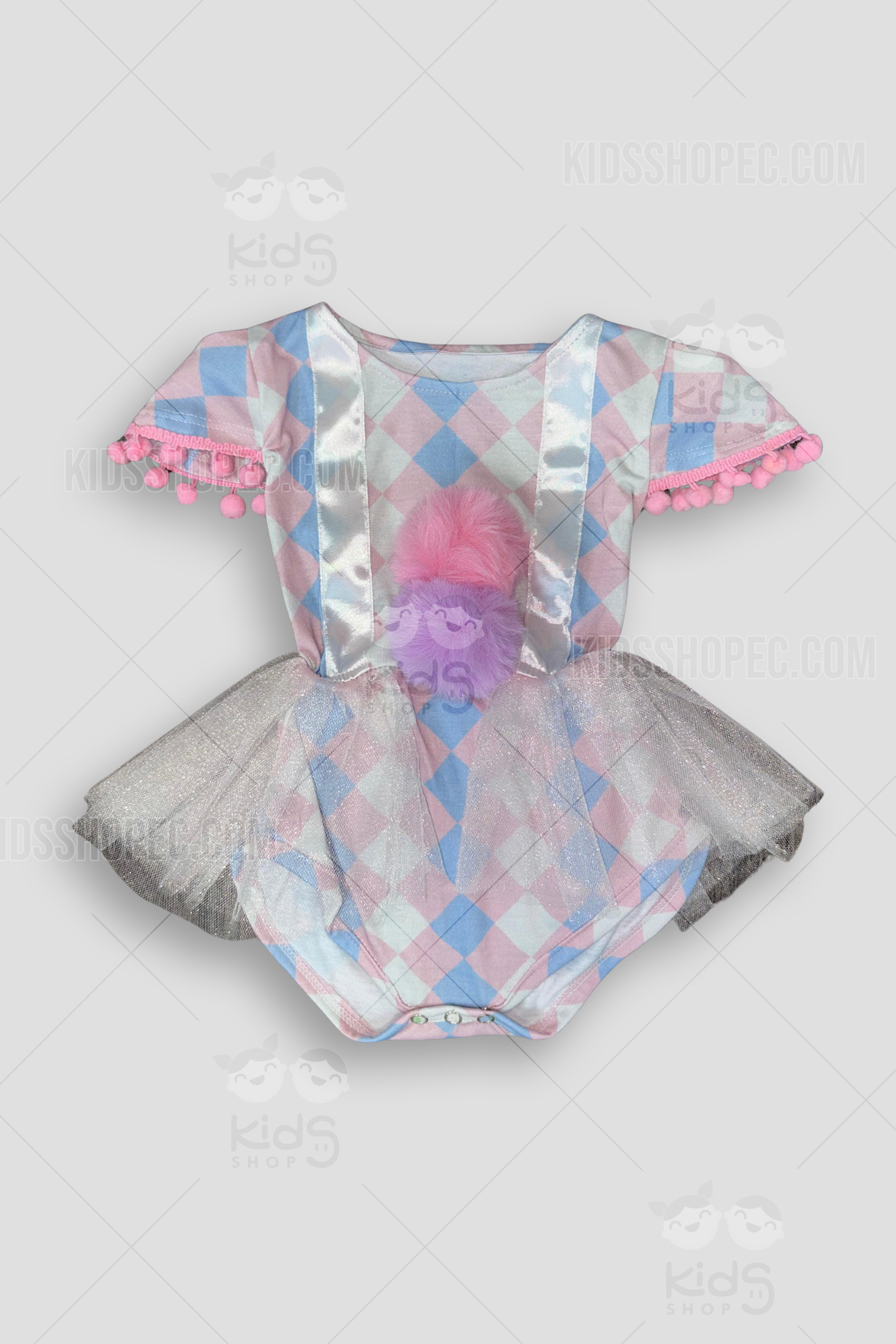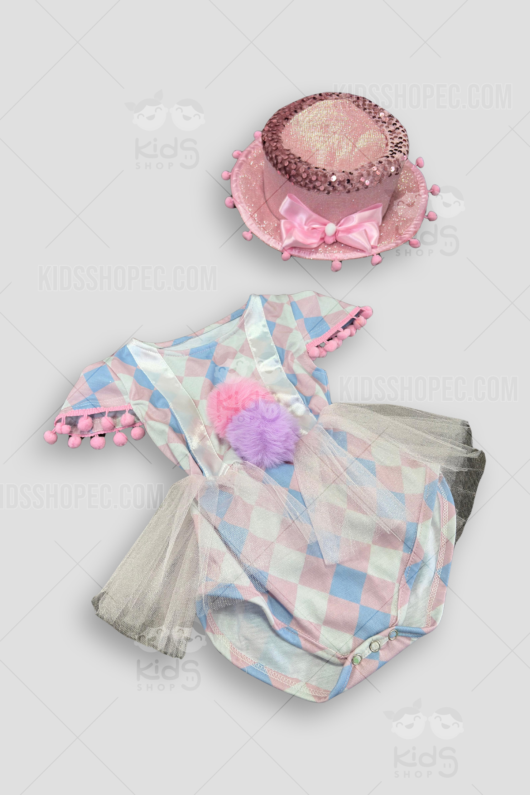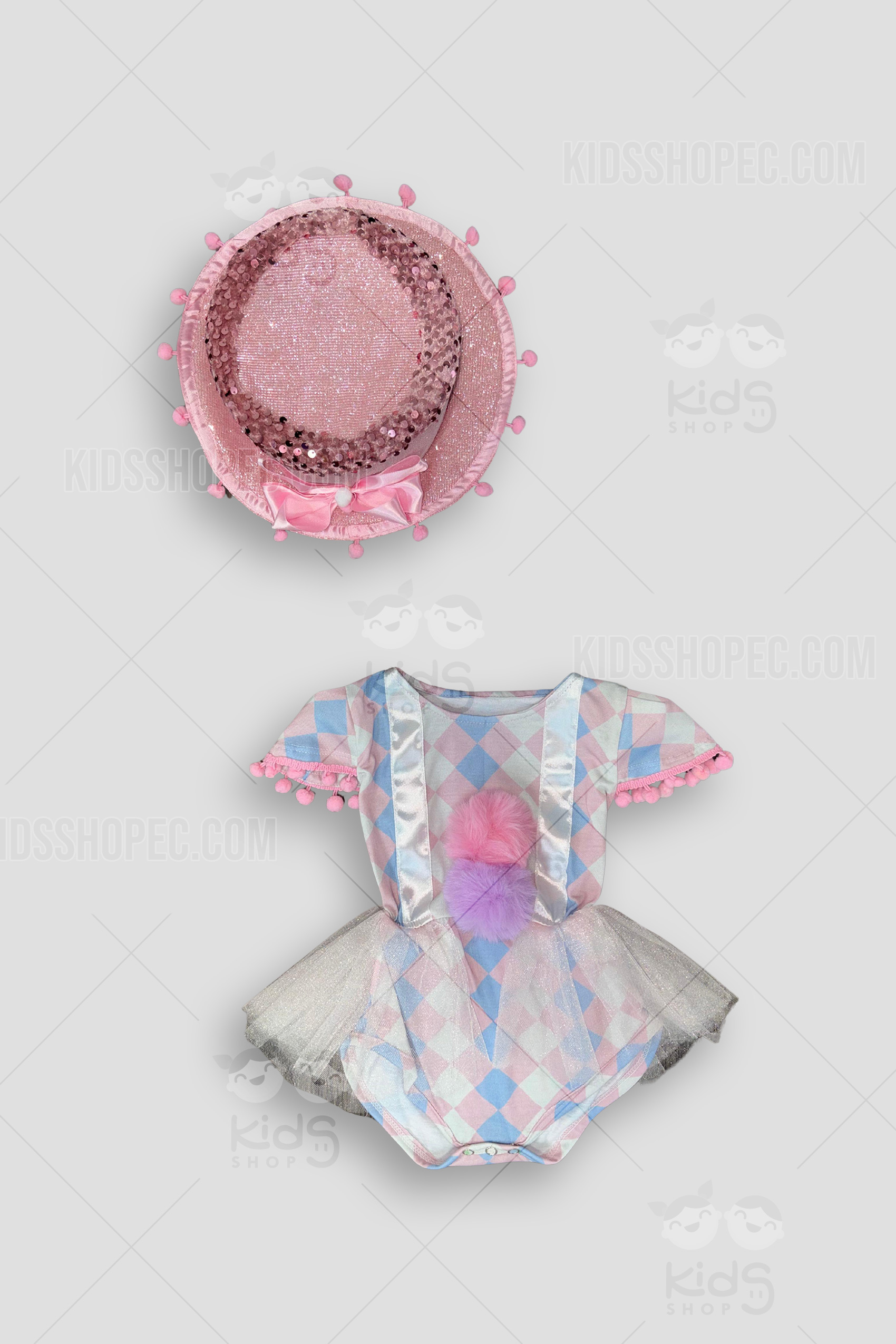 ¡La estrella del espectáculo ha llegado! Con nuestro Disfraz "Domadora del Circo Mágico", tu pequeña está lista para robarse el aplauso en su primera gran función. Este traje de circo para niña o bebé es un adorable set de 2 piezas de pura fantasía: incluye un body-tutú con un tierno patrón de arlequín (rombos) en colores pastel (rosa y azul), una falda de tul plateado brillante y detalles encantadores como pompones en las mangas y el pecho. ¡Y para el gran final, el espectacular sombrero de copa rosa con glitter, lentejuelas y un gran lazo de satén! Es el disfraz de payasita o domadora ideal para su primer cumpleaños, una fiesta temática de circo o una sesión de fotos inolvidable.
