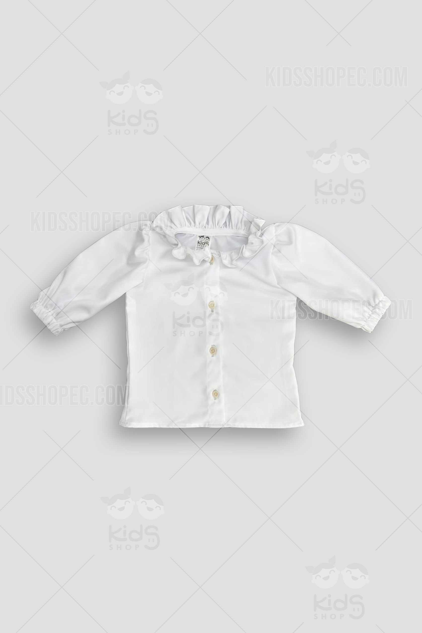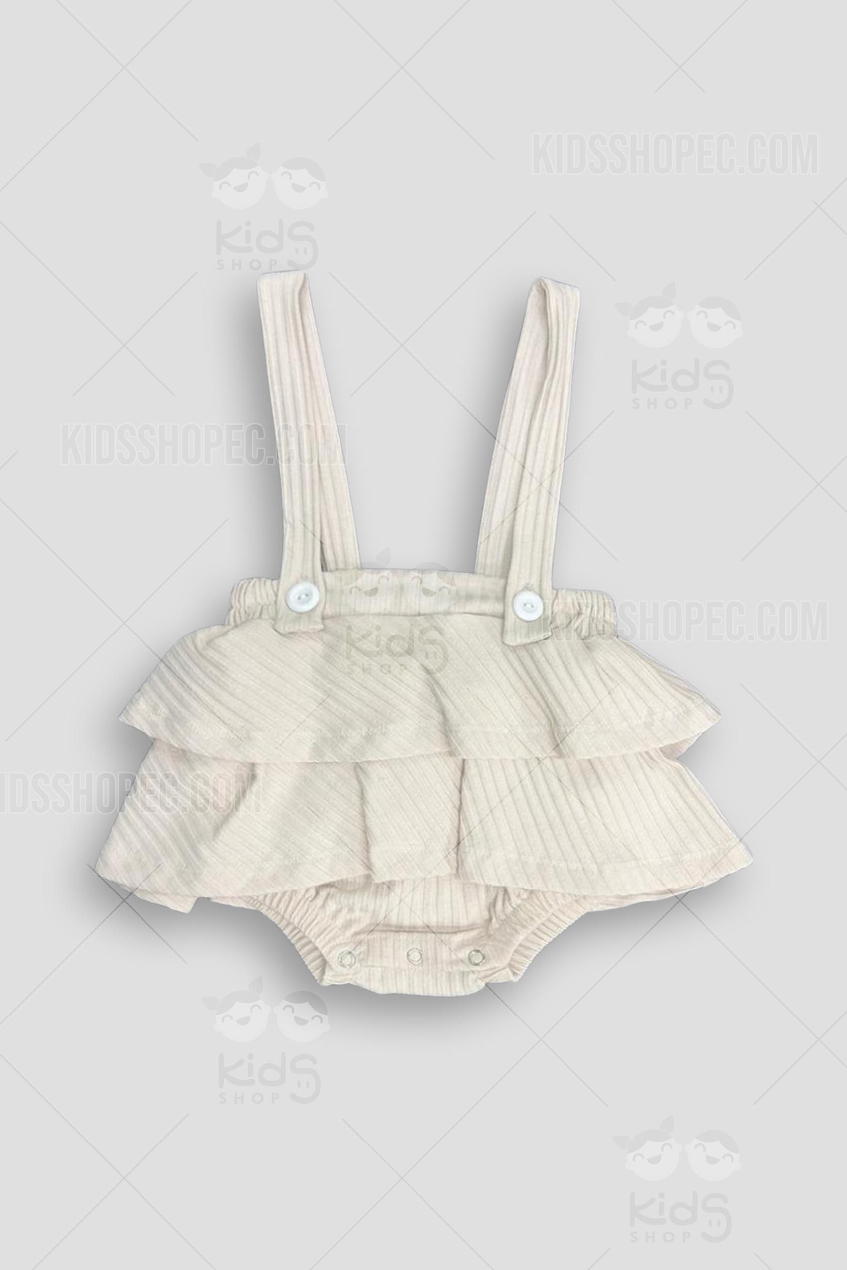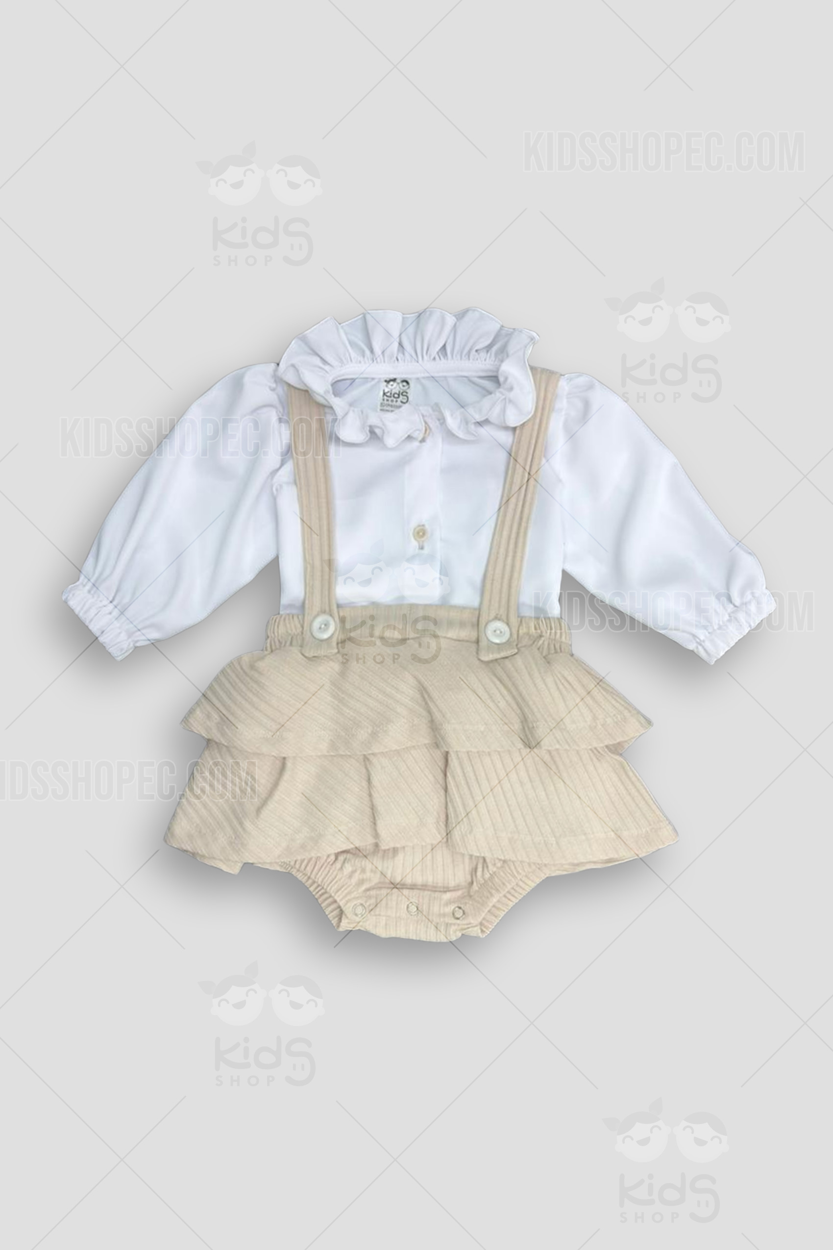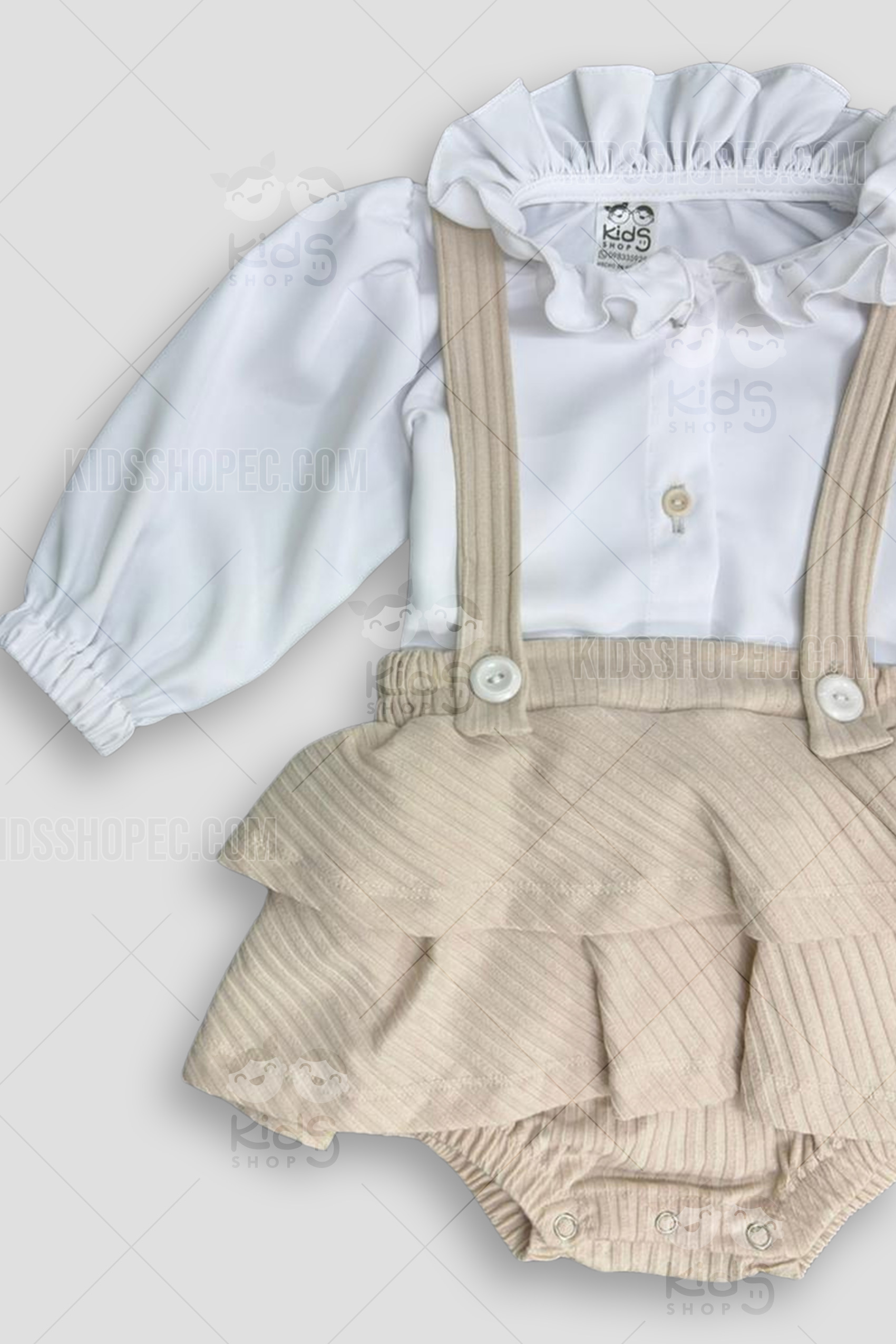 ¡Un look de ensueño para las ocasiones más especiales! Nuestro Conjunto "Elegancia Vintage" destaca por su diseño clásico y sofisticado, inspirado en la moda europea y la tendencia coquette. El set de 2 piezas incluye una delicada blusa blanca de mangas largas abullonadas, protagonizada por un hermoso cuello con vuelos rizados que enmarca el rostro con dulzura. Se complementa a la perfección con un body tipo romper en color beige/nude con textura acanalada suave; este cuenta con tirantes estilo peto y una falda de volantes en capas que aporta volumen y movimiento. Además de hermoso, es práctico: incluye broches en la parte inferior para facilitar el cambio de pañal. ¡Ideal para bautizos casuales, sesiones de fotos o cumpleaños elegantes!