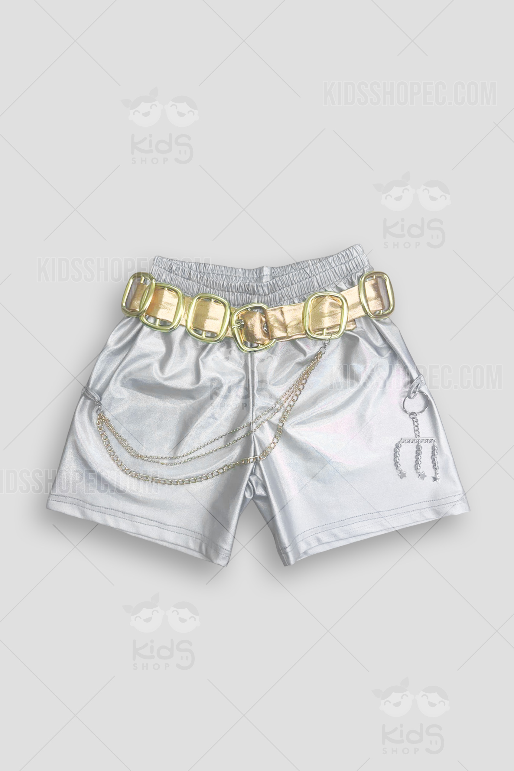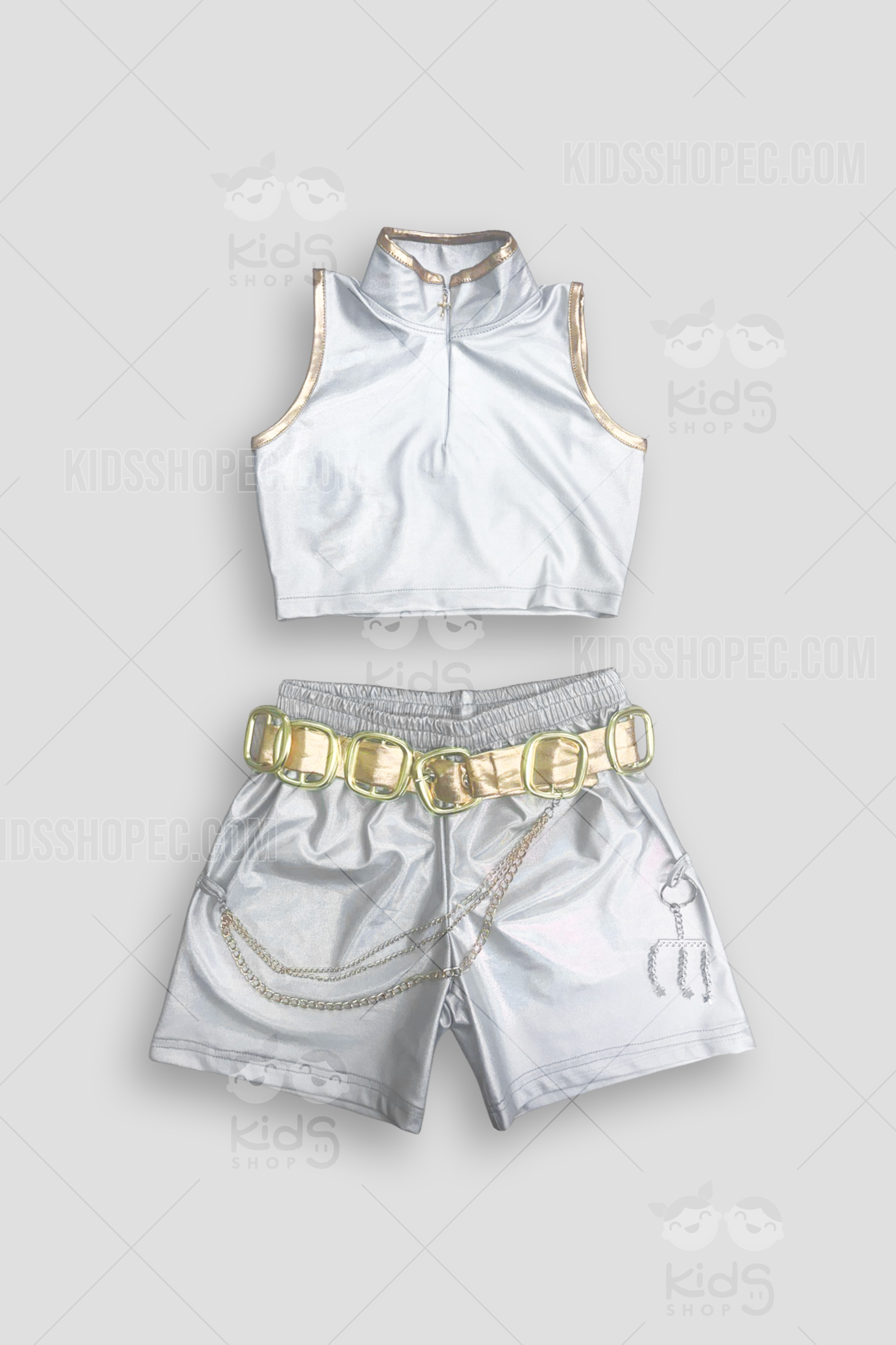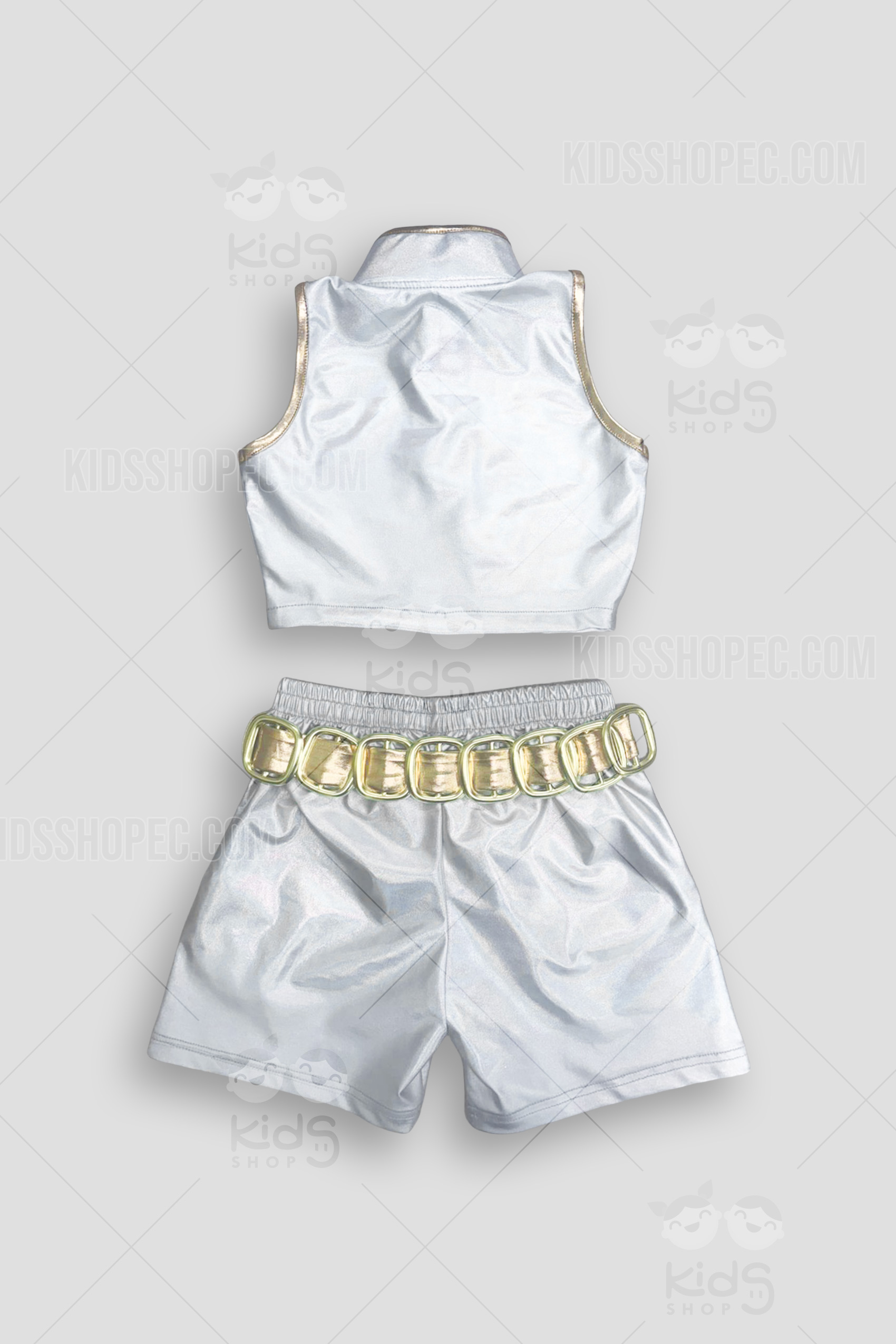¡Lista para cazar demonios con el mejor estilo de Seúl! Inspirado en la estética de las series de "K-pop Demon Hunters" (Cazadores de Demonios K-pop), este es el uniforme de batalla para la idol más valiente. Este traje de 2 piezas en plateado metálico te da un look futurista y poderoso, e incluye un crop top de cuello alto con elegantes bordes dorados y un short a juego con un imponente cinturón dorado y cadenas de combate. Es el disfraz de K-pop definitivo, listo para un dance cover lleno de acción o para demostrar quién manda en la noche de Halloween.