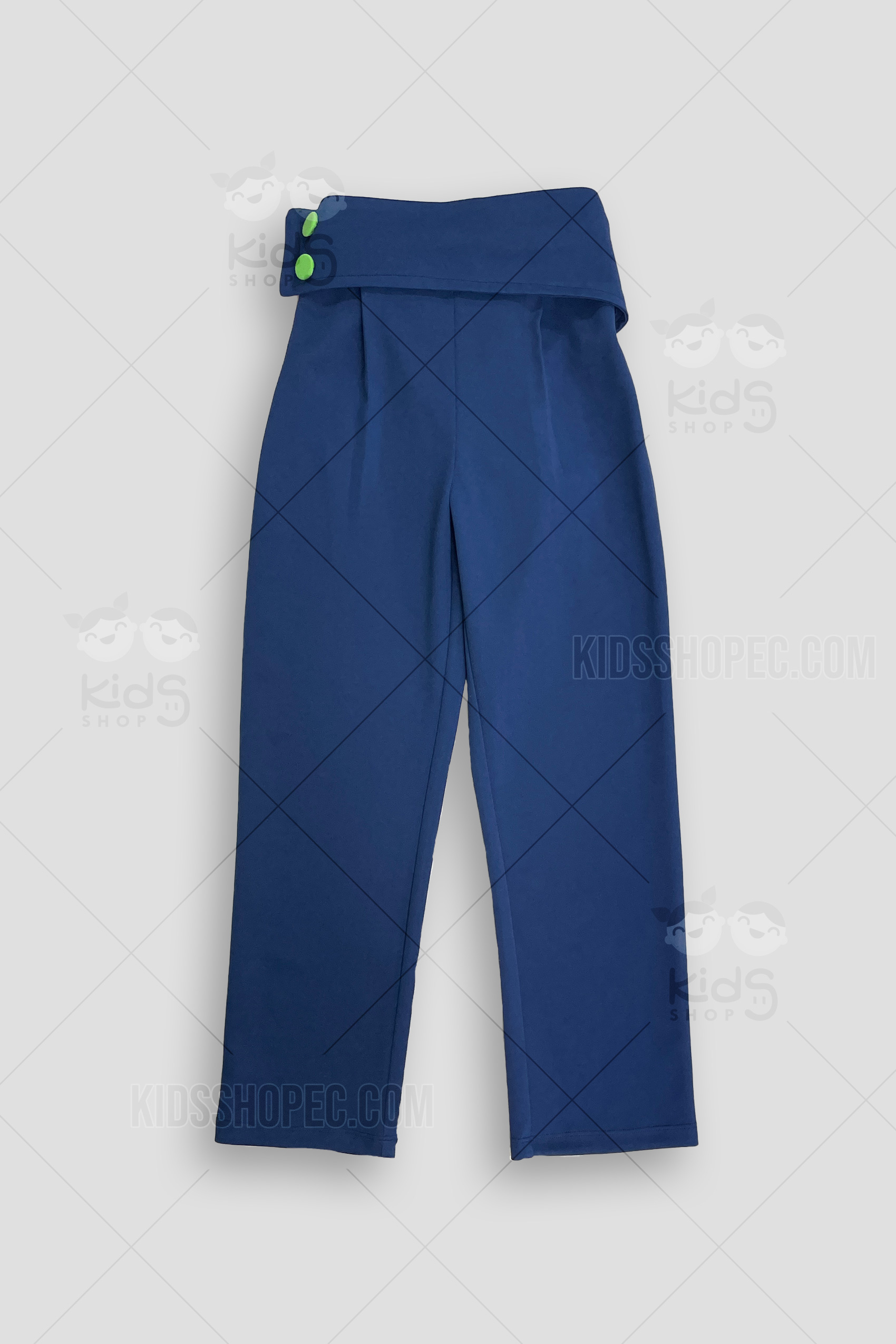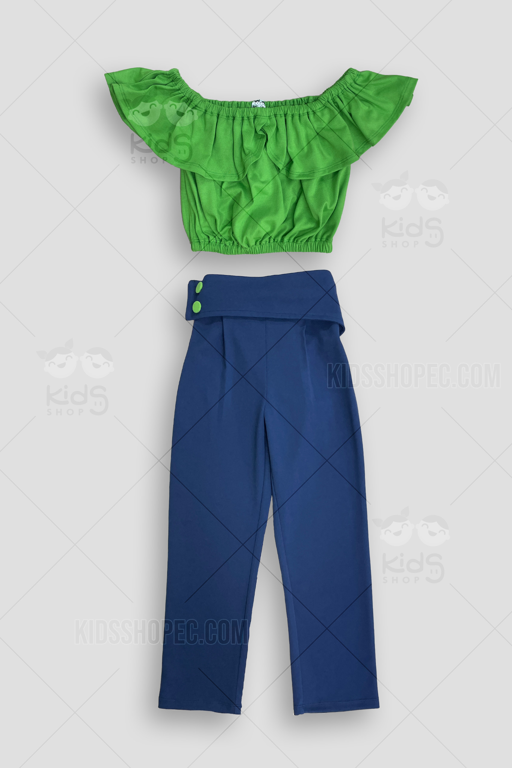 Este vibrante y moderno conjunto de dos piezas es una excelente opción para cualquier ocasión. Incluye un top de manga corta con volantes y hombros descubiertos, en un llamativo color verde que resalta. El top se combina a la perfección con un pantalón de corte ancho en color azul marino, que presenta un diseño de cintura alta con solapas y un detalle de botón. Este atuendo es ideal para que las niñas se vean a la moda, cómodas y listas para destacar en cualquier evento, desde una fiesta hasta una reunión familiar.