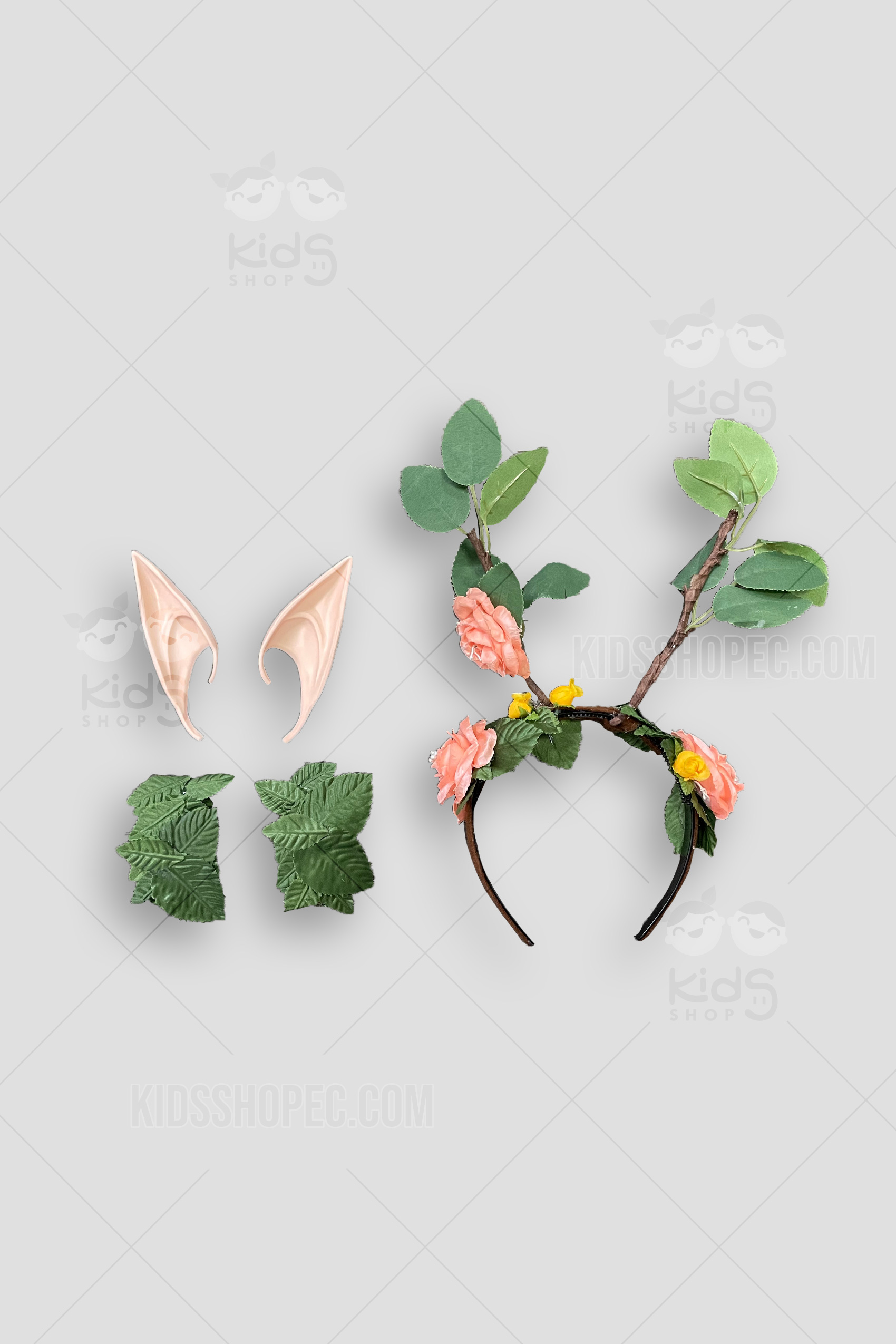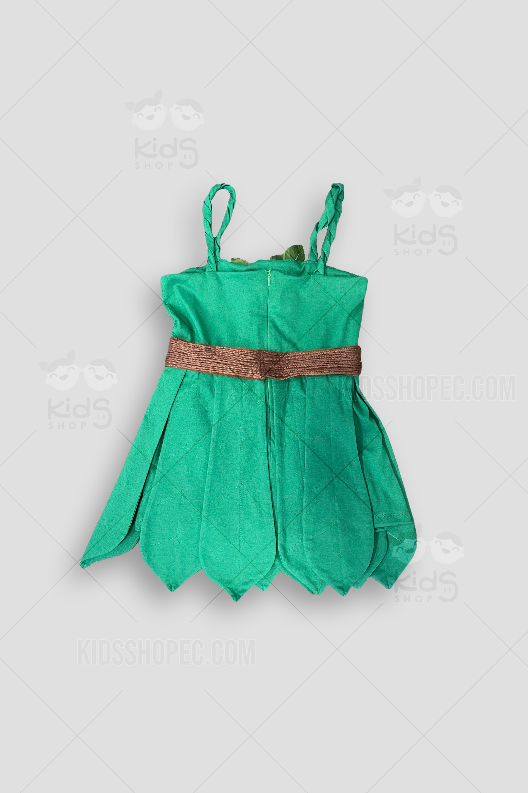 Este es un hermoso vestido de disfraz con un toque de cuento de hadas, perfecto para que las niñas se vistan como una Elfa, Duende o Hada del Bosque. El vestido presenta una combinación de los colores verde y blanco, con un cuerpo que de terciopelo verde y un cuello y puños festivos de tela blanca o con ribete. La falda tiene un diseño en capas con volantes, y el conjunto incluye un de cuerda para definir la cintura. Se completa con una distintava diadema de flores. Es un conjunto elegante y alegre, ideal para obras de teatro, fiestas de disfraces o cualquier evento temático de fantasía.