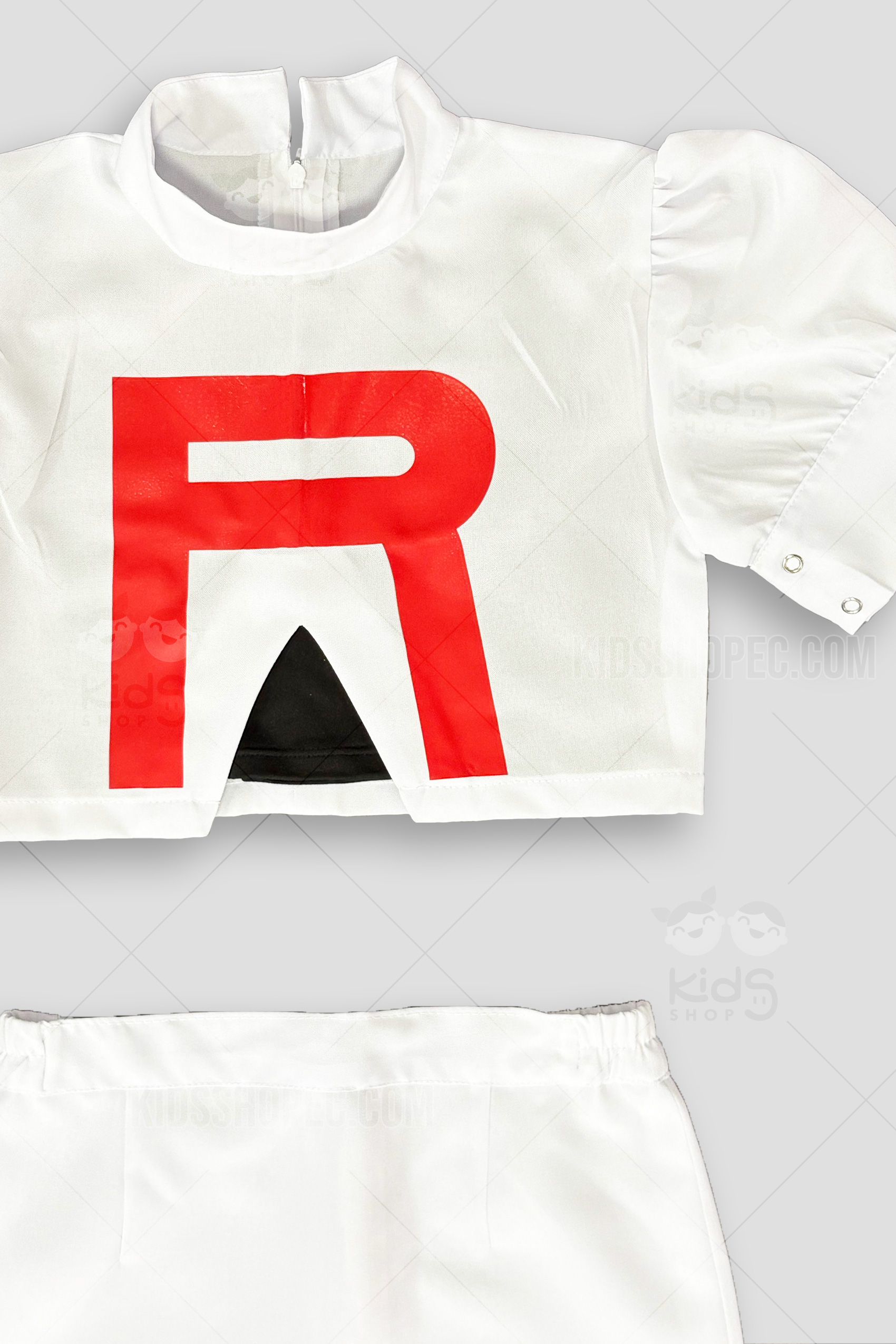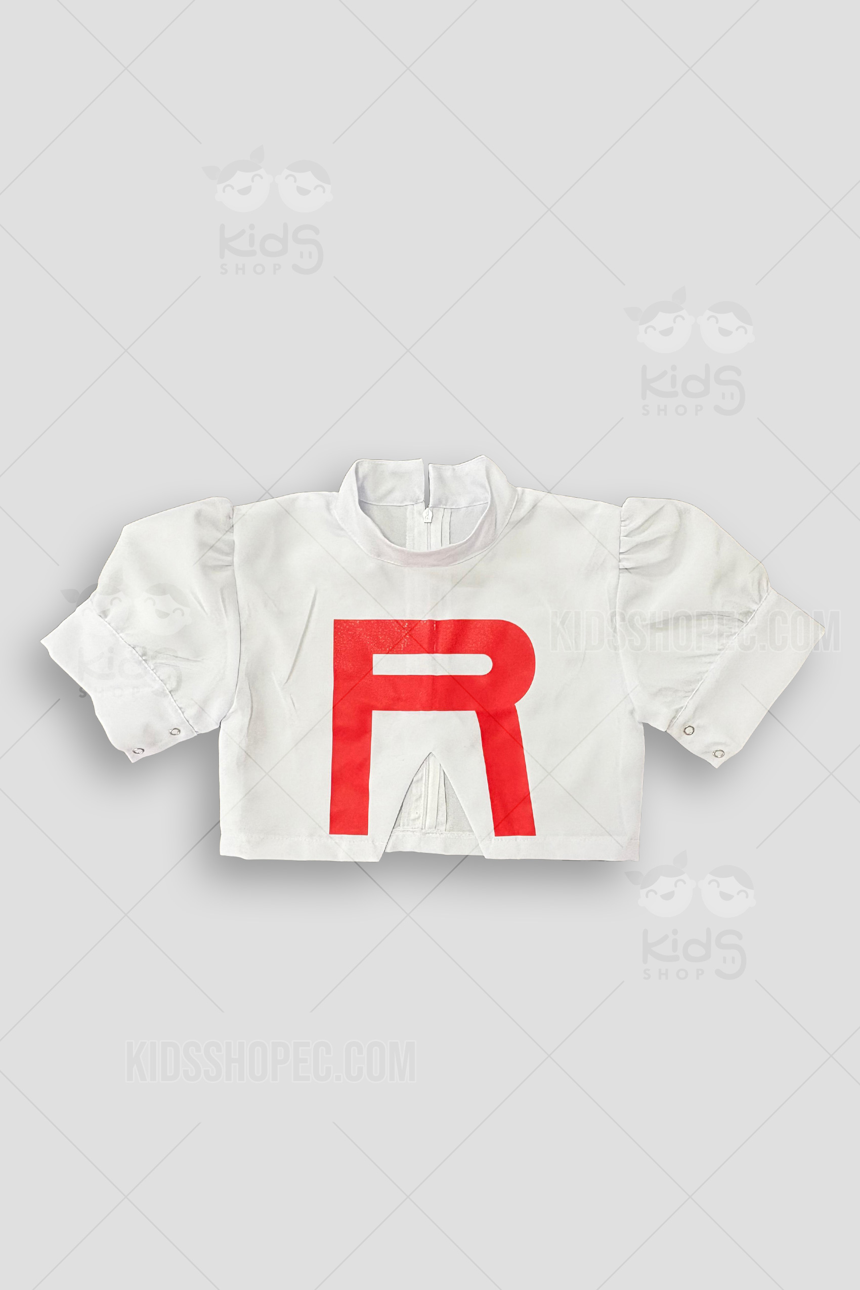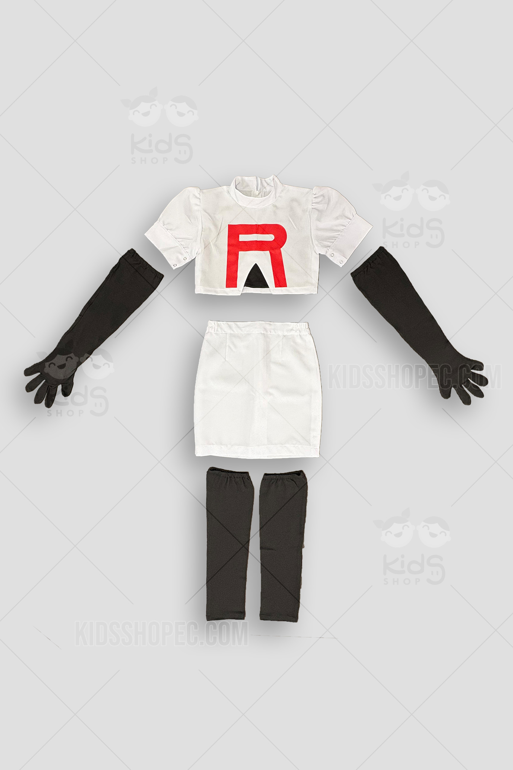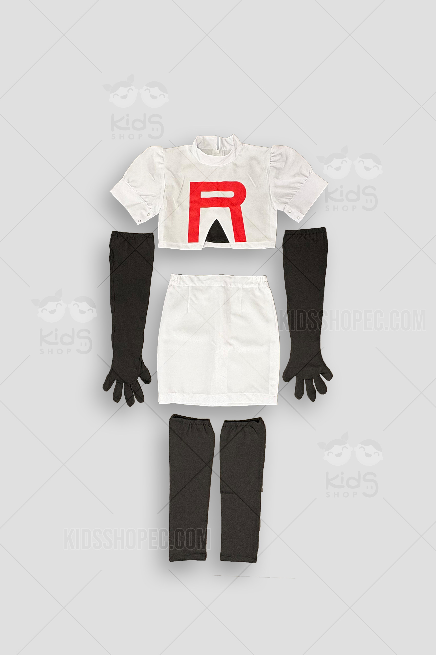 Lleva a tu pequeño a formar parte del Equipo Rocket y a planear sus malvados planes para robar Pokémon con este auténtico disfraz de Jessie. Ideal para fiestas temáticas de Pokémon, eventos de anime y manga, Halloween, convenciones o para jugar a ser villanos con estilo. El atuendo principal consiste en una top de manga corta con guantes de color negro, complementada con una minifalda de color blanco. El icónico emblema de la "R" roja del Equipo Rocket está presente en la camiseta para un reconocimiento instantáneo. El look se completa con guantes y medias que añaden el toque final al estilo de la villana. Confeccionado con materiales cómodos y duraderos para que tu pequeño villano pueda ejecutar sus planes con total libertad.