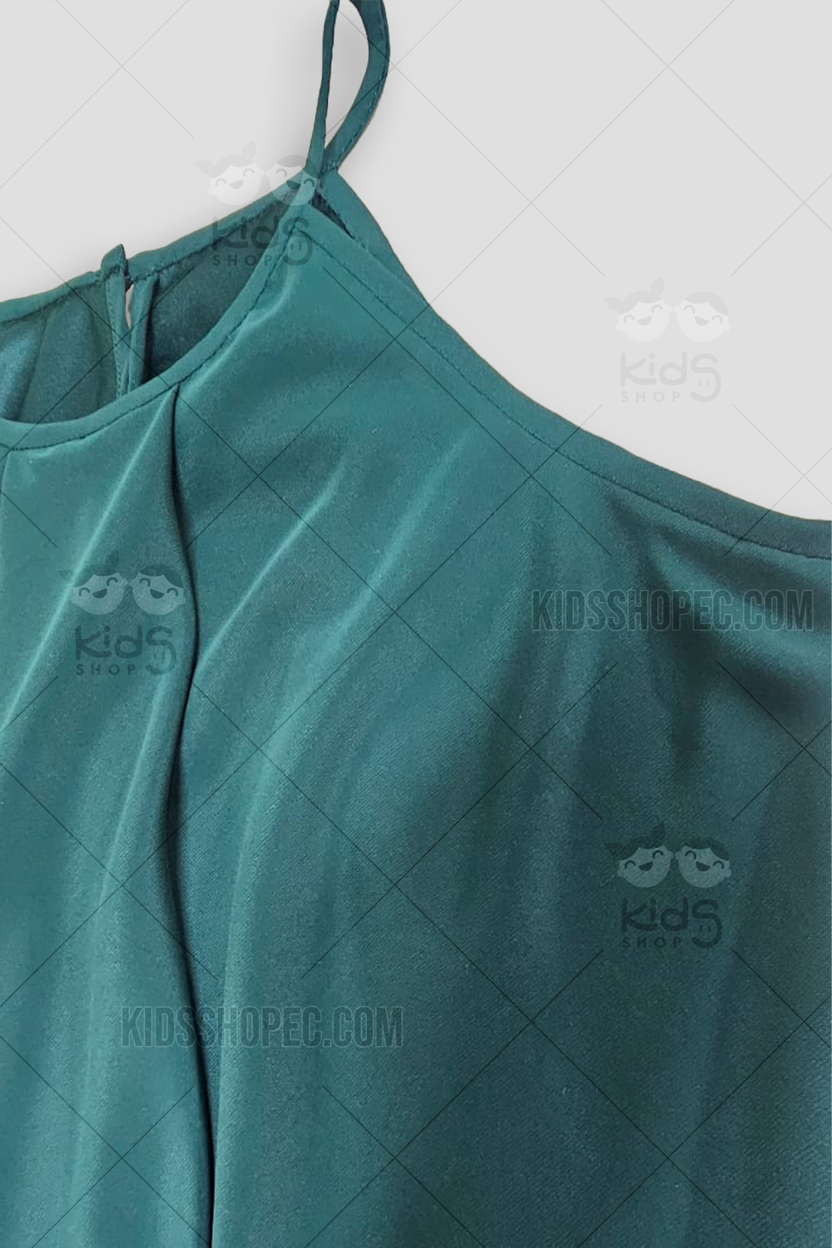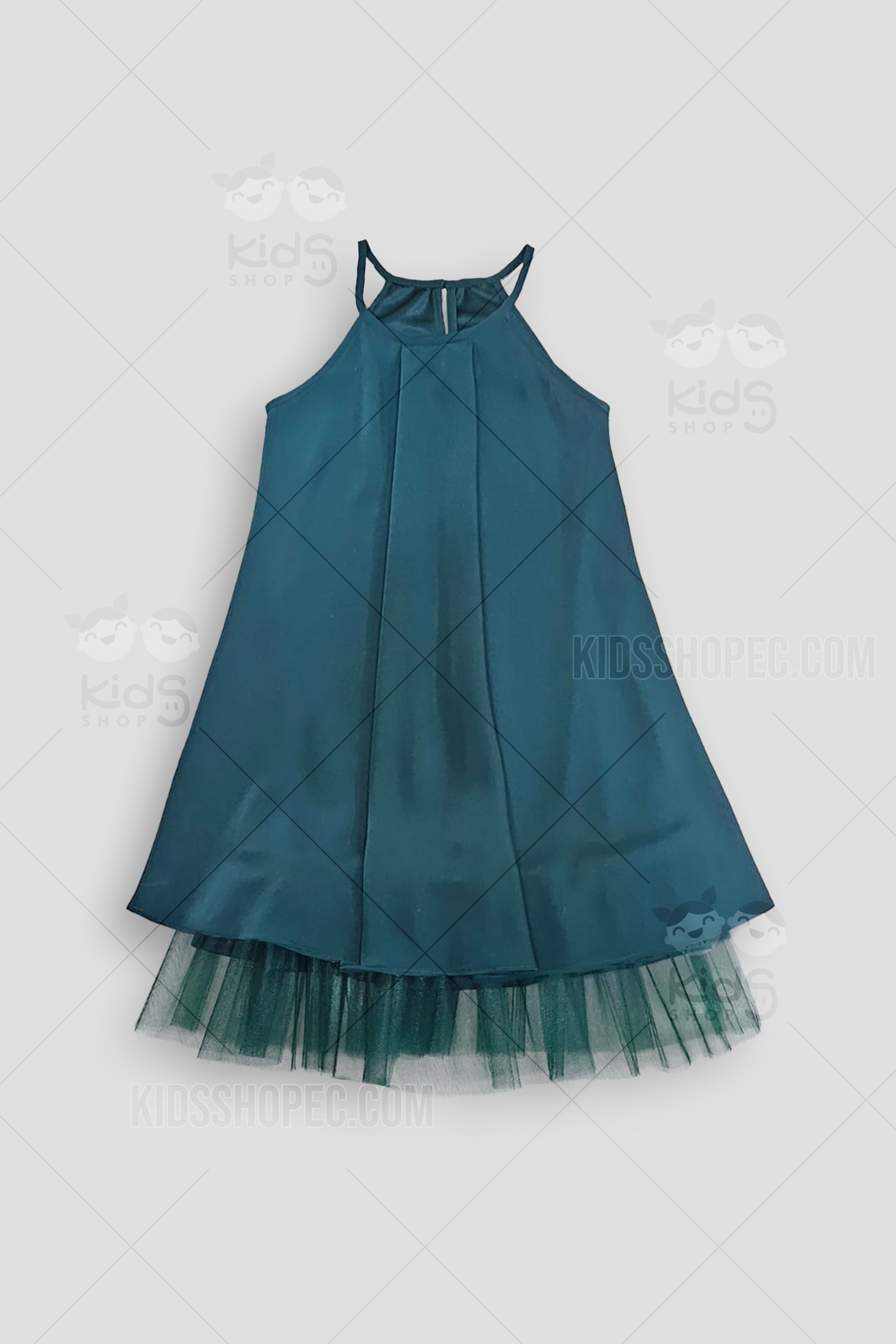 Elegante vestido de fiesta en color azul, con diseño de tirantes cortos. La falda presenta un doblez plisado en la parte frontal y un delicado detalle de tul en el borde inferior, añadiendo un toque de sofisticación y estilo. Ideal para ocasiones especiales y eventos formales.