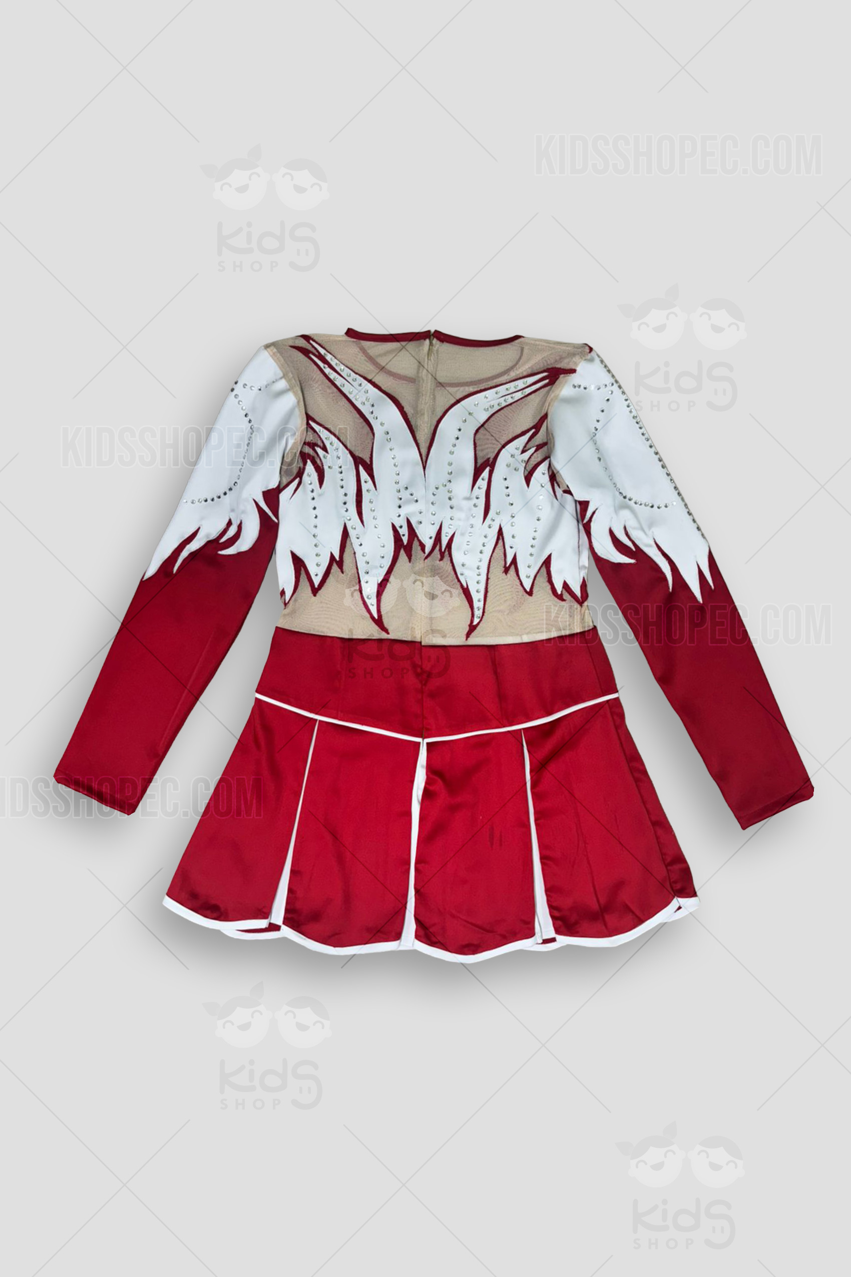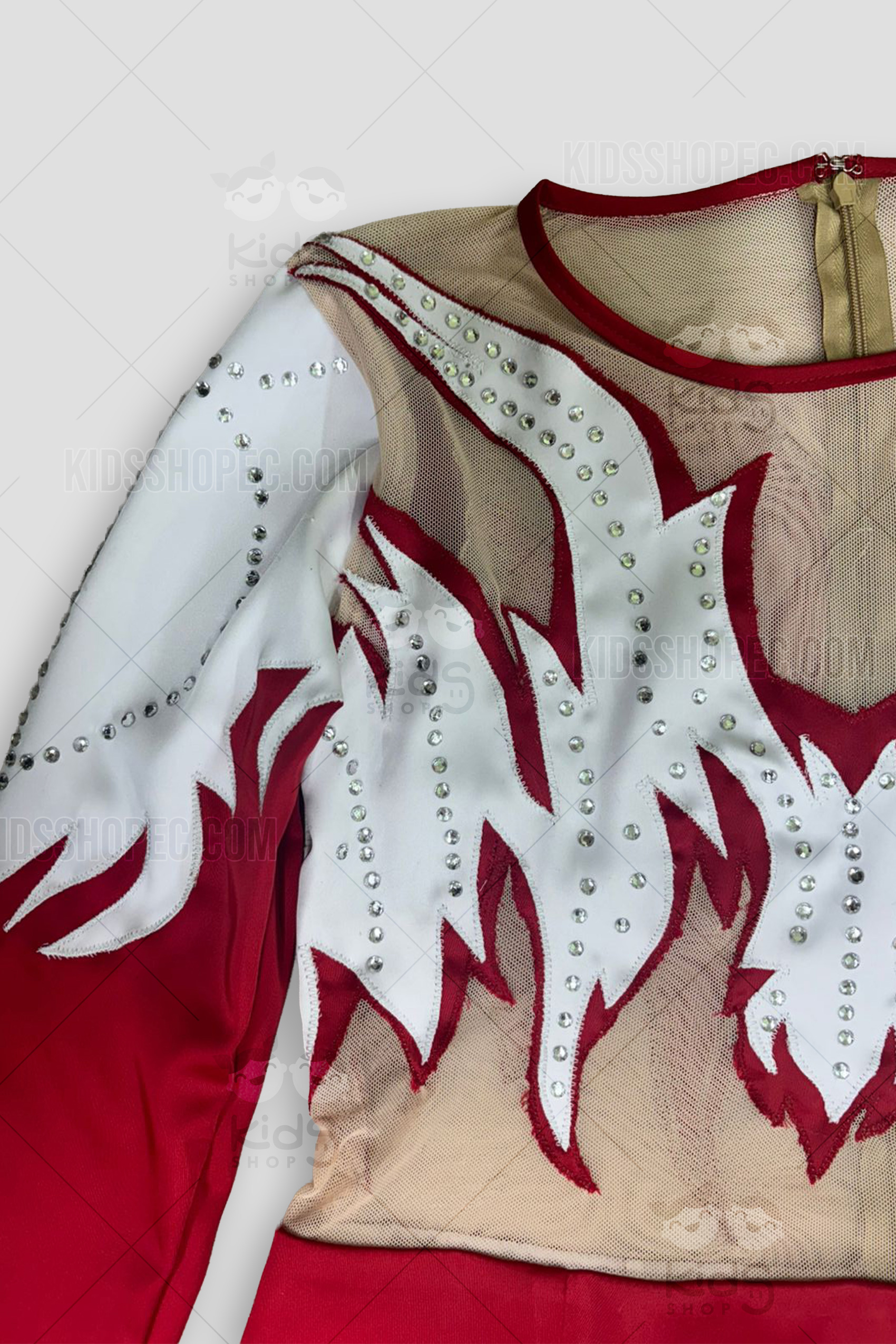 ¡Prepara el escenario para una actuación ganadora! Tu pequeña brillará como una estrella con nuestro Leotardo de Competencia "Fénix Ardiente". Este traje de gimnasia rítmica (o patinaje artístico) es una impresionante pieza única diseñada para impactar. El leotardo de manga larga combina un rojo vibrante con un espectacular diseño de alas o llamas en blanco, artísticamente sobrepuesto en malla color piel. Y para el toque de campeona, ¡todo el diseño está cubierto de pedrería (rhinestones) que deslumbra con cada movimiento! La falda tableada roja y blanca está incorporada, asegurando una línea fluida y un movimiento elegante en cada giro. Es el maillot de competencia definitivo para brillar en la pista o el escenario.