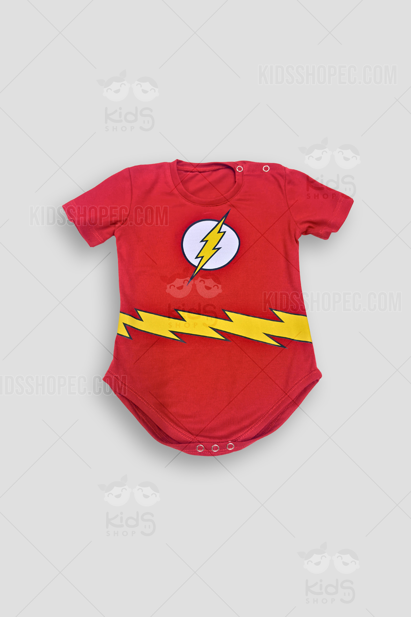 ¡El superhéroe más rápido y adorable de la casa! Este Conjunto de Flash para Bebé es la opción ideal para padres fanáticos de los cómics y la Liga de la Justicia. El set consta de un body (pañalero) rojo de manga corta, confeccionado en tela suave y fresca (probablemente algodón) para cuidar la piel delicada del bebé. Luce el icónico logo del rayo en el pecho y un cinturón amarillo en zigzag estampado en la cintura. Para un look completo, incluye un gorrito rojo a juego decorado con dos rayos amarillos. Cuenta con prácticos broches en el hombro y la entrepierna para facilitar el cambio. ¡Perfecto para sesiones de fotos geek, Halloween o como un regalo de Baby Shower inolvidable!