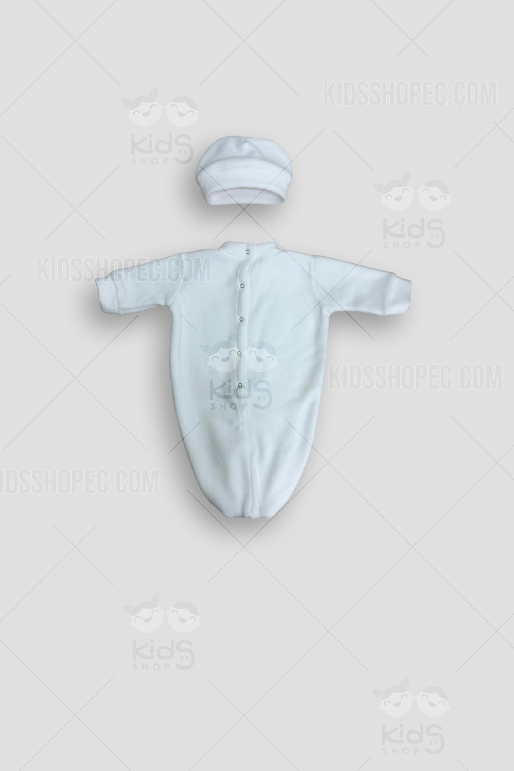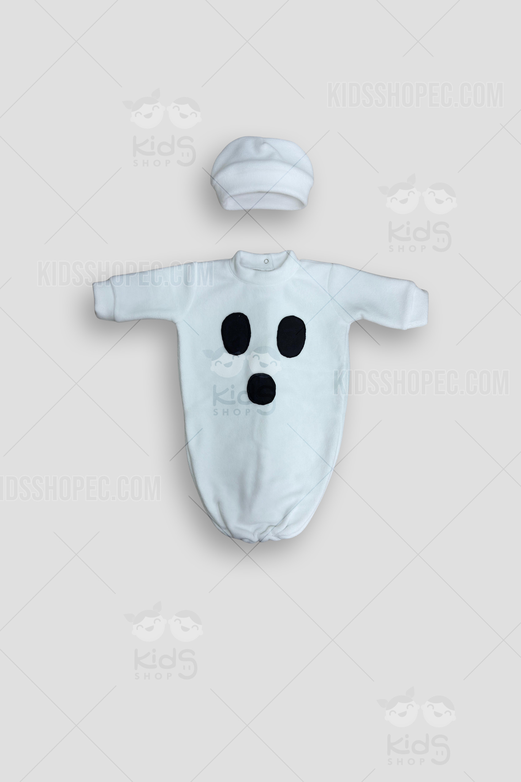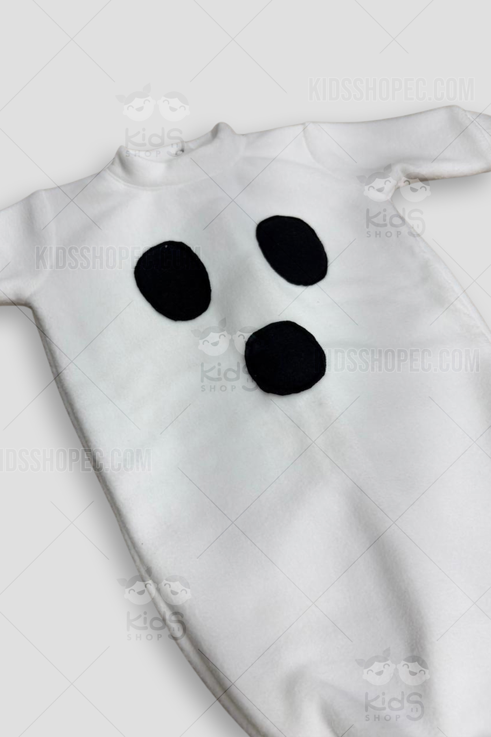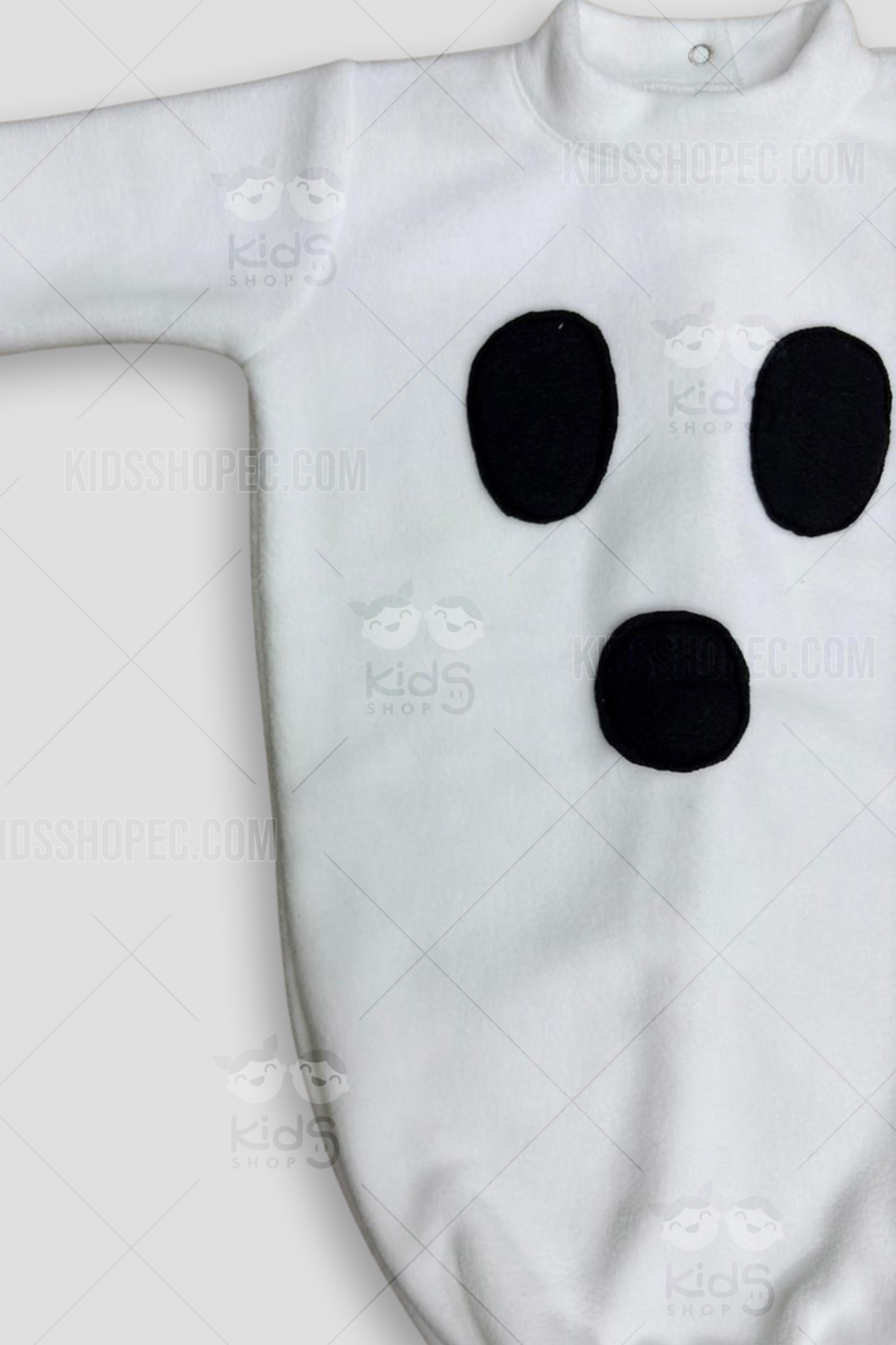 Este es un encantador body o mameluco de disfraz diseñado para bebés y niños pequeños, perfecto para Halloween o fiestas de disfraces. Confeccionado en una suave tela de color blanco o hueso, este enterizo es cómodo y fácil de poner. Presenta el diseño clásico de un fantasma amigable, con una capucha que tiene grandes ojos negros y una expresión sonriente (o sorprendida), además de un pequeño moño/lazo en la parte superior para un toque dulce. El borde inferior del mameluco está cortado en forma de picos irregulares, imitando el tradicional vuelo de una sábana de fantasma. Es el traje ideal para que el bebé se vea increíblemente tierno y abrigado.