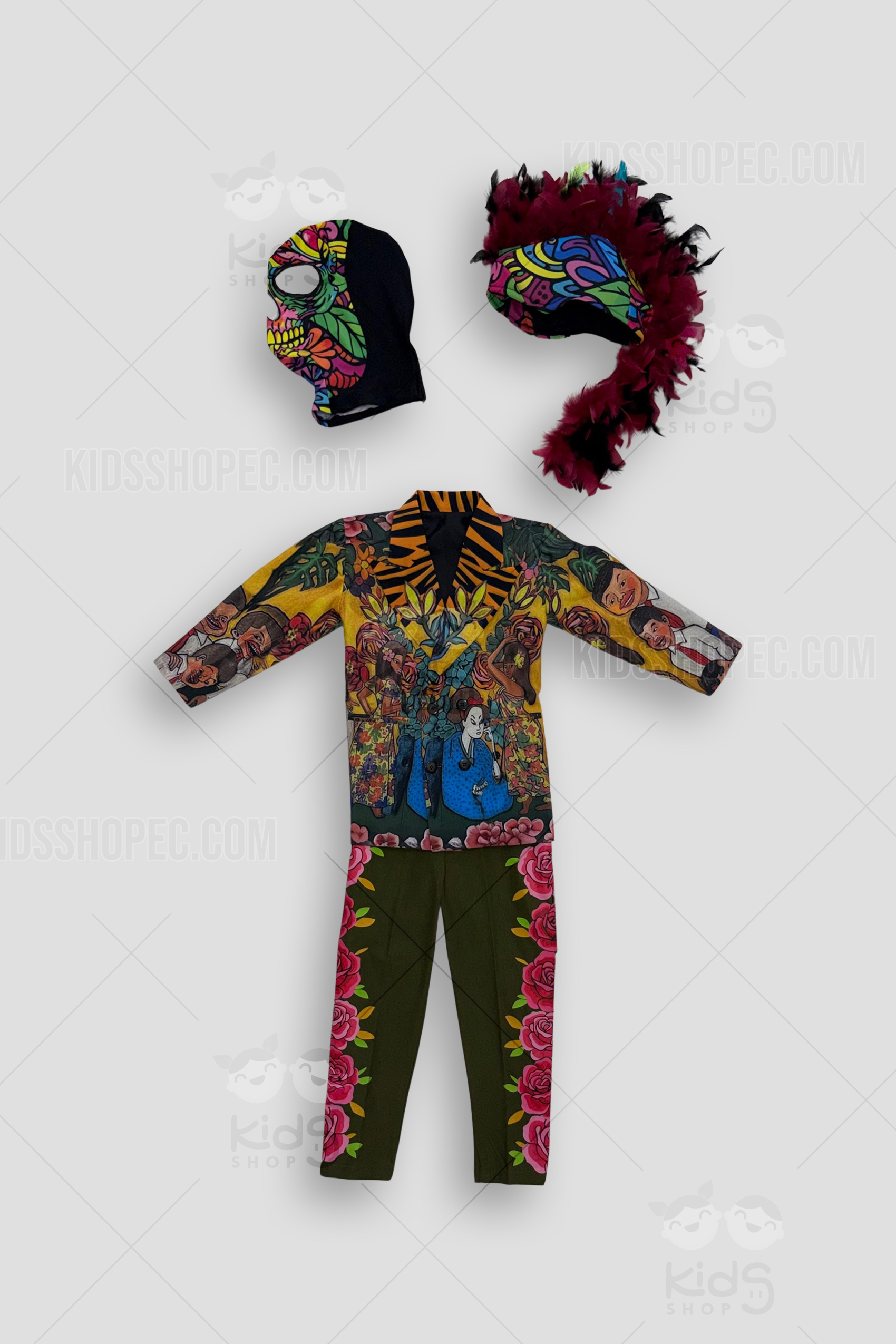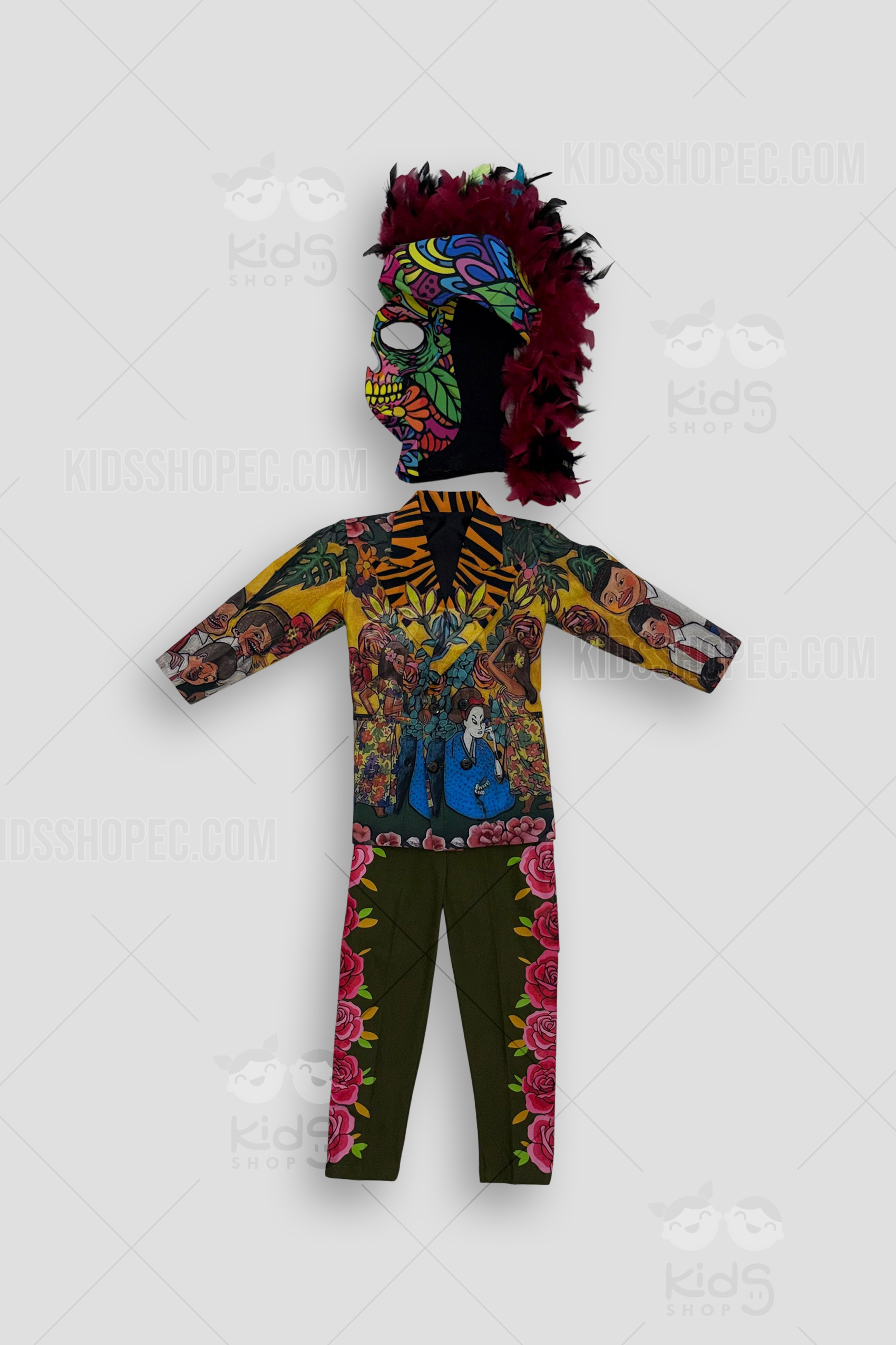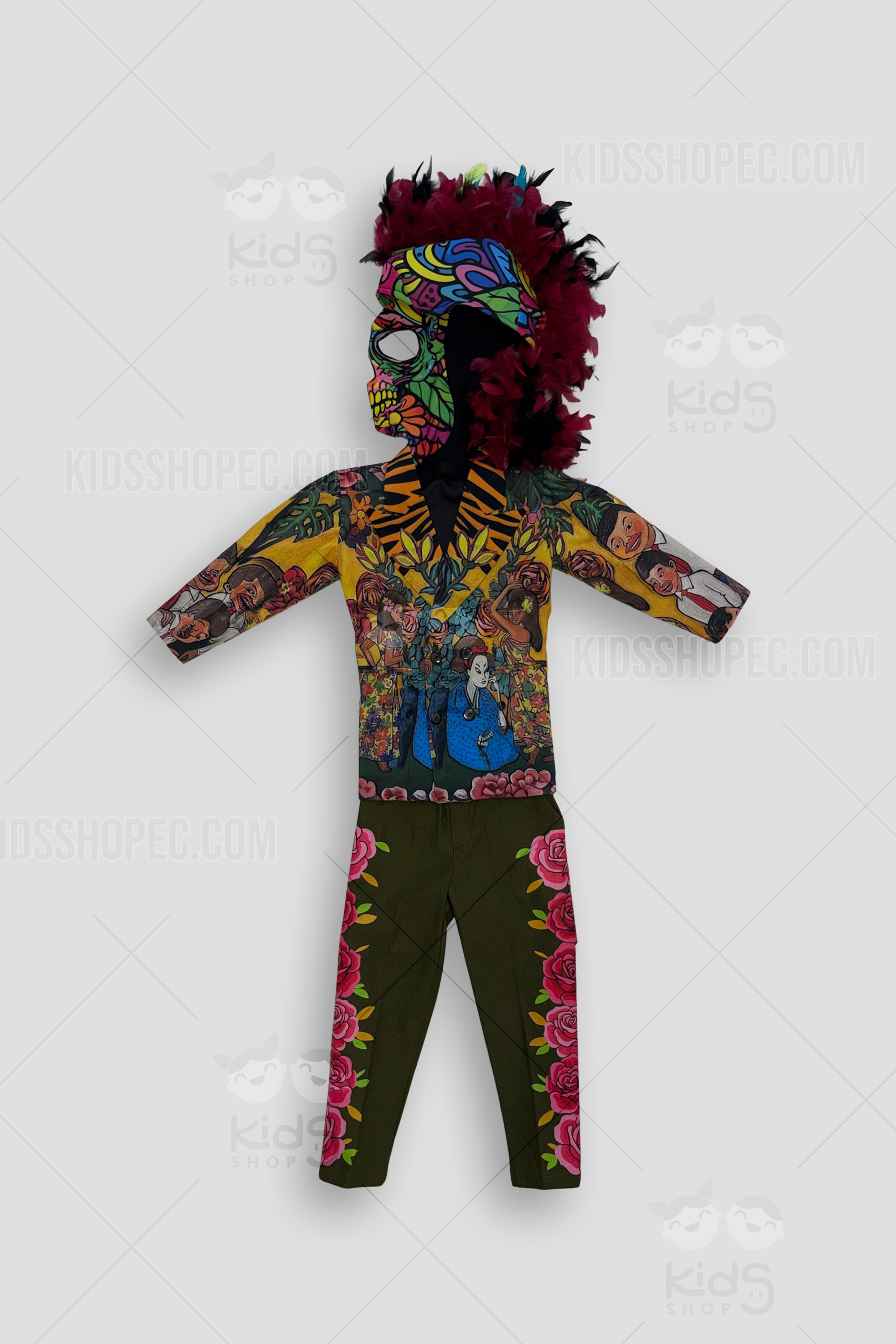 ¡Prepara los flashes y la música! Tu pequeño será la estrella del festival con nuestro Disfraz "Calavera Rockstar" del Día de los Muertos. Este vibrante conjunto de calavera para niño de 3 piezas es pura magia y arte, combinando una espectacular chaqueta de arte pop con solapas atigradas, un cómodo pantalón verde olivo con rosas rojas trepadoras al estilo mariachi, y la increíble máscara de pasamontañas de calavera con una ¡cresta de plumas de rockstar! Es el traje de Día de los Muertos para niño perfecto para celebrar la tradición, arrasar en Halloween o cualquier fiesta de disfraces. ¡Una declaración de alegría y actitud en un solo atuendo!