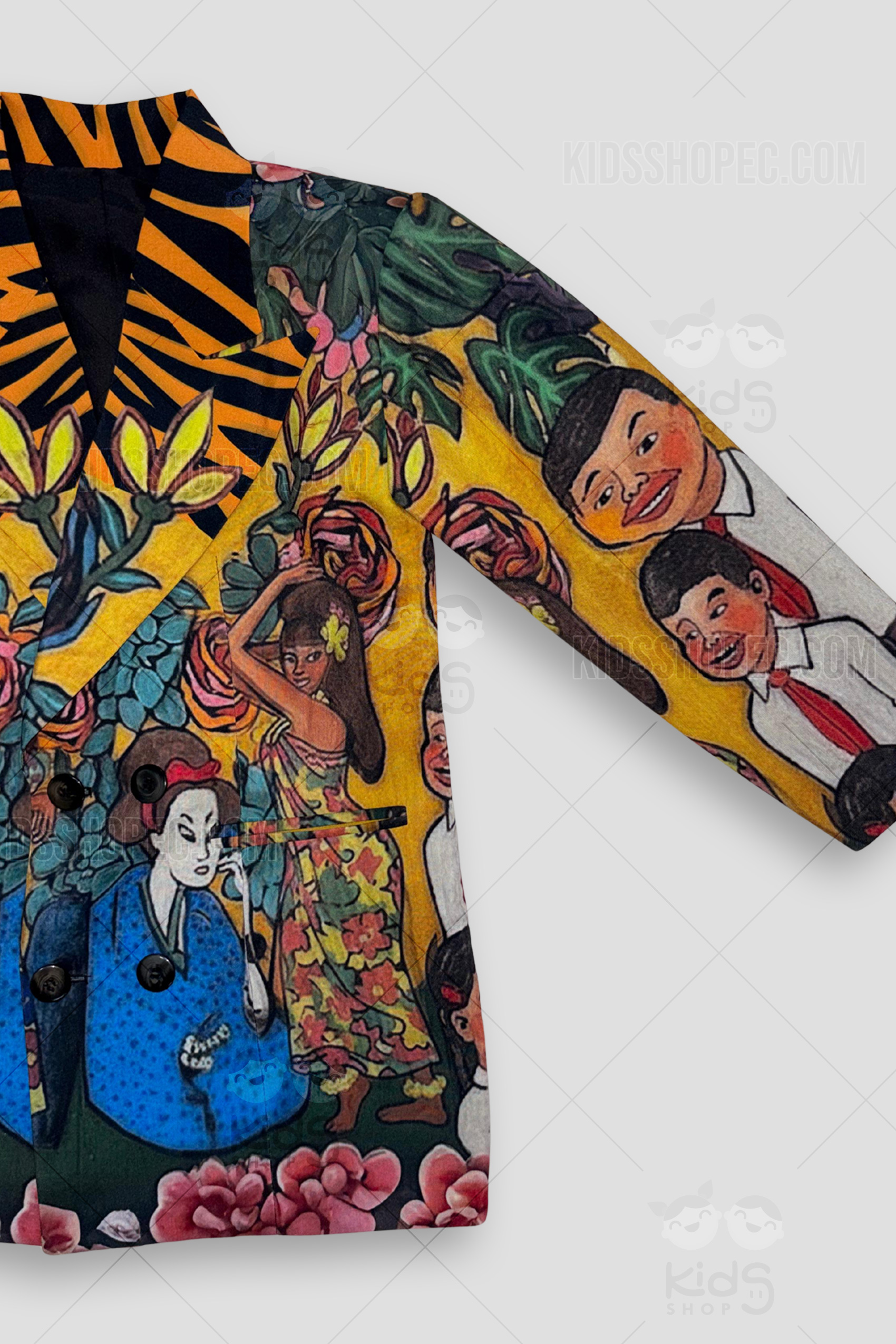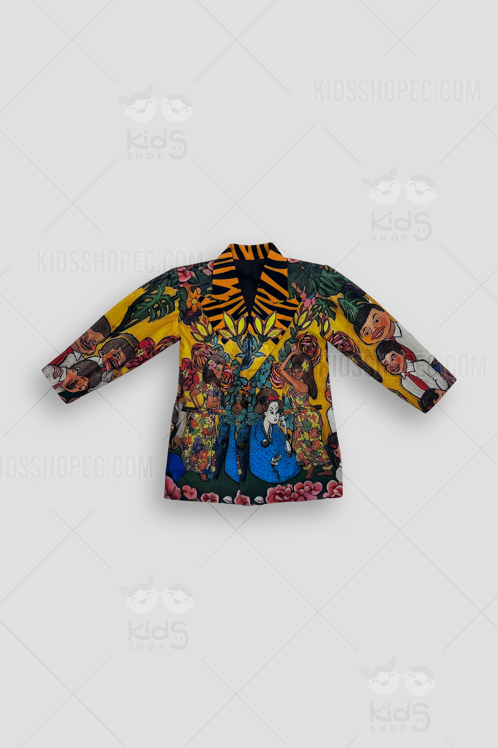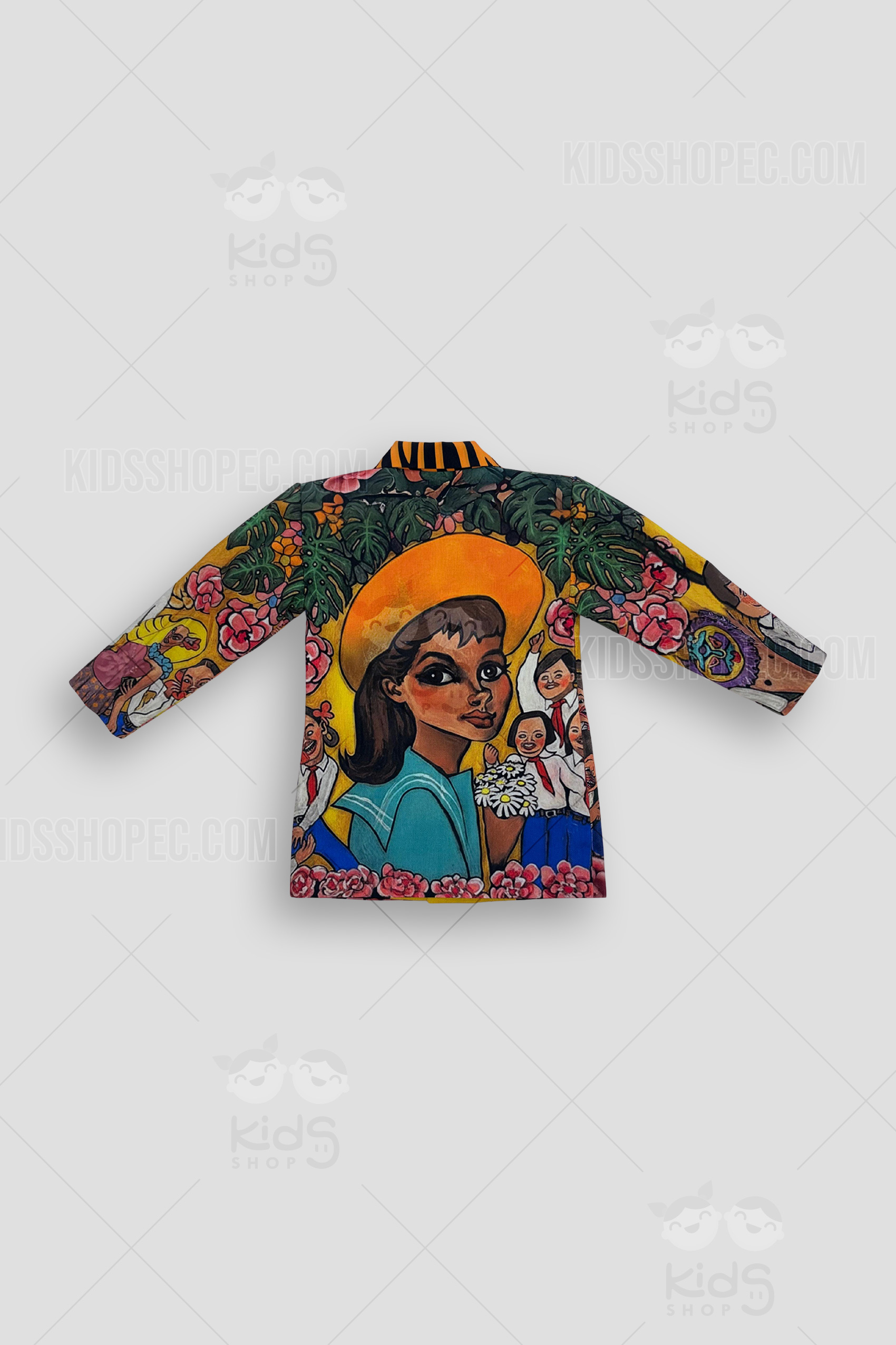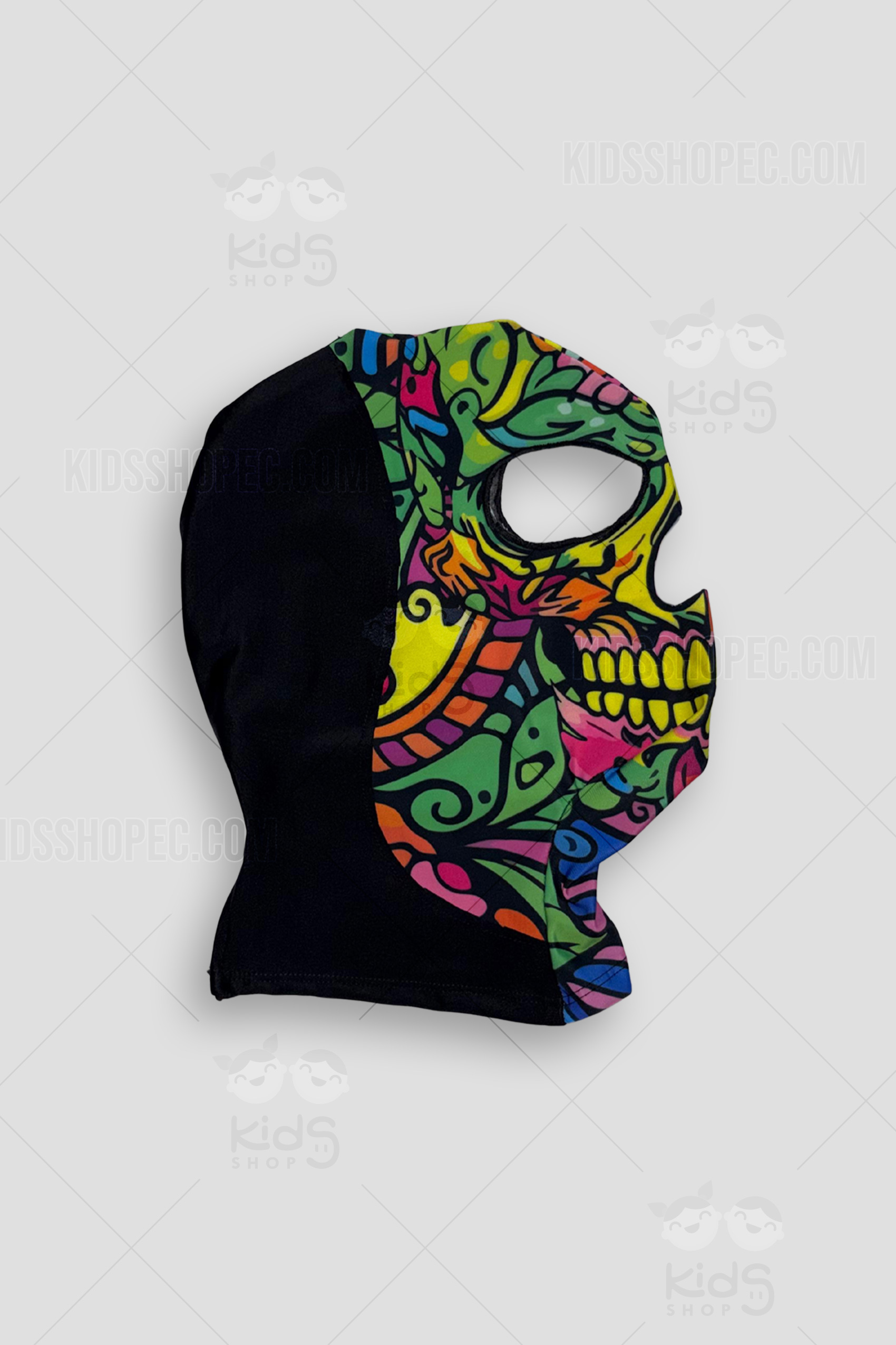 ¡Prepara los flashes y la música! Tu pequeño será la estrella del festival con nuestro Disfraz "Calavera Rockstar" del Día de los Muertos. Este vibrante conjunto de calavera para niño de 3 piezas es pura magia y arte, combinando una espectacular chaqueta de arte pop con solapas atigradas, un cómodo pantalón verde olivo con rosas rojas trepadoras al estilo mariachi, y la increíble máscara de pasamontañas de calavera con una ¡cresta de plumas de rockstar! Es el traje de Día de los Muertos para niño perfecto para celebrar la tradición, arrasar en Halloween o cualquier fiesta de disfraces. ¡Una declaración de alegría y actitud en un solo atuendo!
