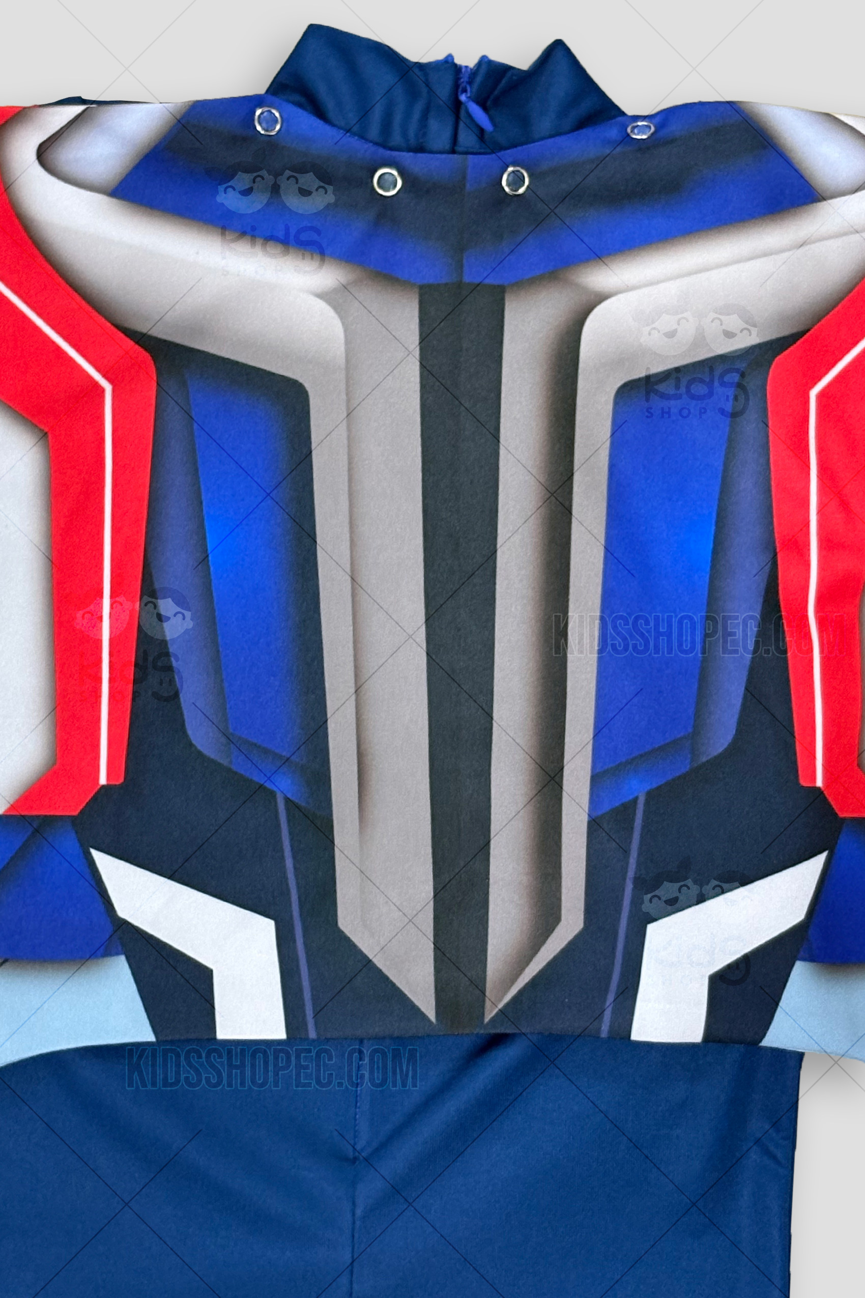Este es un impresionante disfraz completo del Capitán América para niños, diseñado para inspirar grandes aventuras. El atuendo principal es un mono de cuerpo entero en los icónicos colores azul, rojo y blanco, con detalles estampados que simulan la armadura y el uniforme del superhéroe. Incluye un llamativo par de alas desmontables o integradas en la espalda, reminiscentes de la versión de Falcon/Capitán América, y un cinturón para un ajuste perfecto. Para completar la transformación, el conjunto viene con una máscara o capucha azul con la característica "A" y, por supuesto, el inconfundible escudo redondo de Capitán América. Es el disfraz ideal para Halloween, fiestas de disfraces, carnavales o para el juego diario, permitiendo a los niños sentirse como verdaderos Vengadores.