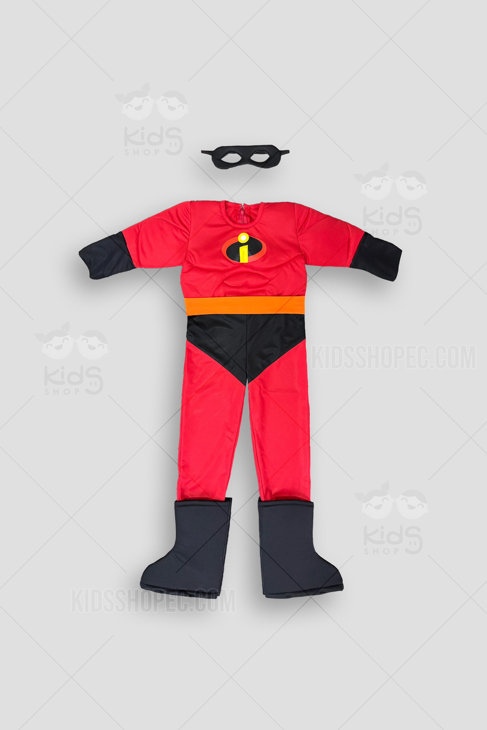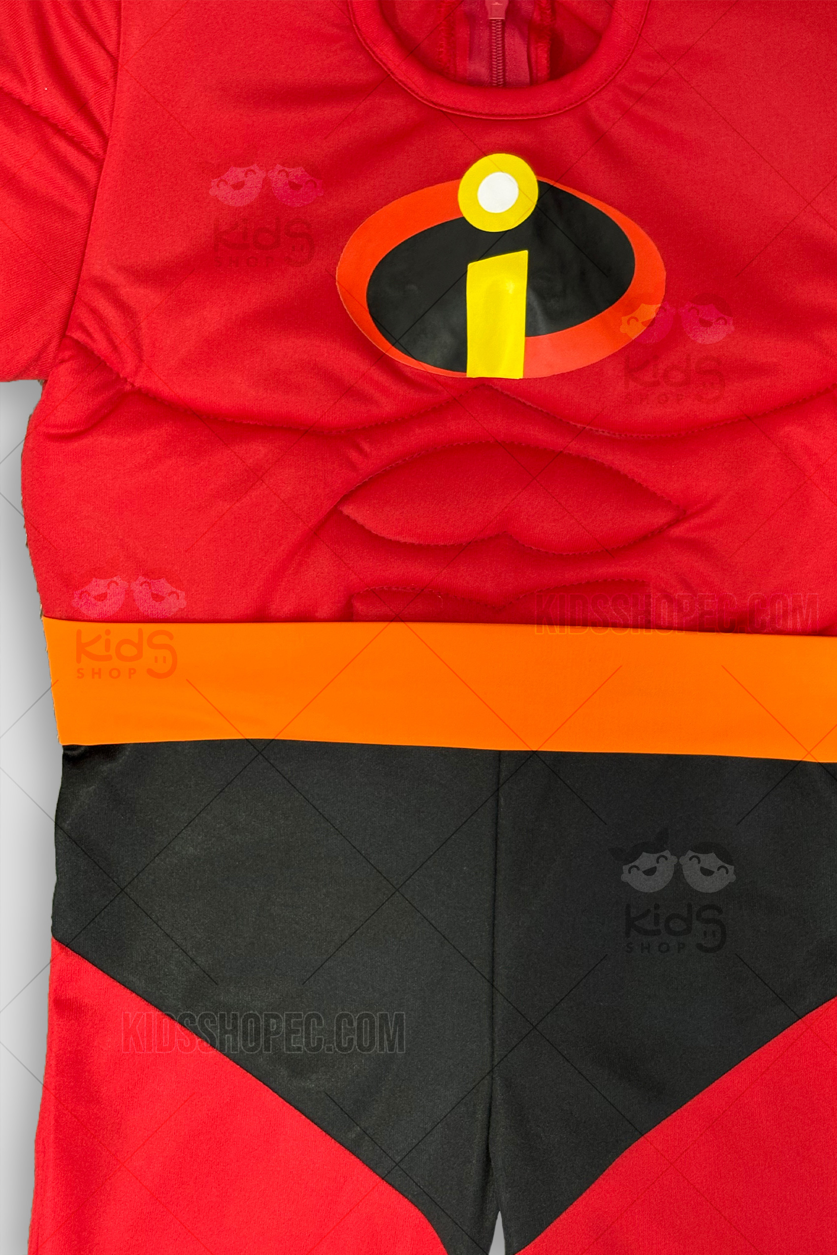 Este es un disfraz de superhéroe de cuerpo completo, idéntico al vestuario de la famosa familia Los Increíbles de Disney Pixar. El mono principal viene en los colores característicos rojo y negro, con una franja ancha naranja o amarilla que simula el cinturón. En el pecho, luce el inconfundible logo de la "i" negra con el círculo. El conjunto incluye un antifaz negro para ocultar la identidad secreta y un par de cubrebotas negras a juego, garantizando un look completo y listo para la acción. Confeccionado para ser cómodo y fácil de llevar, es el atuendo perfecto para Halloween, carnavales, cumpleaños temáticos o para que los niños disfruten de un juego de rol lleno de superpoderes.