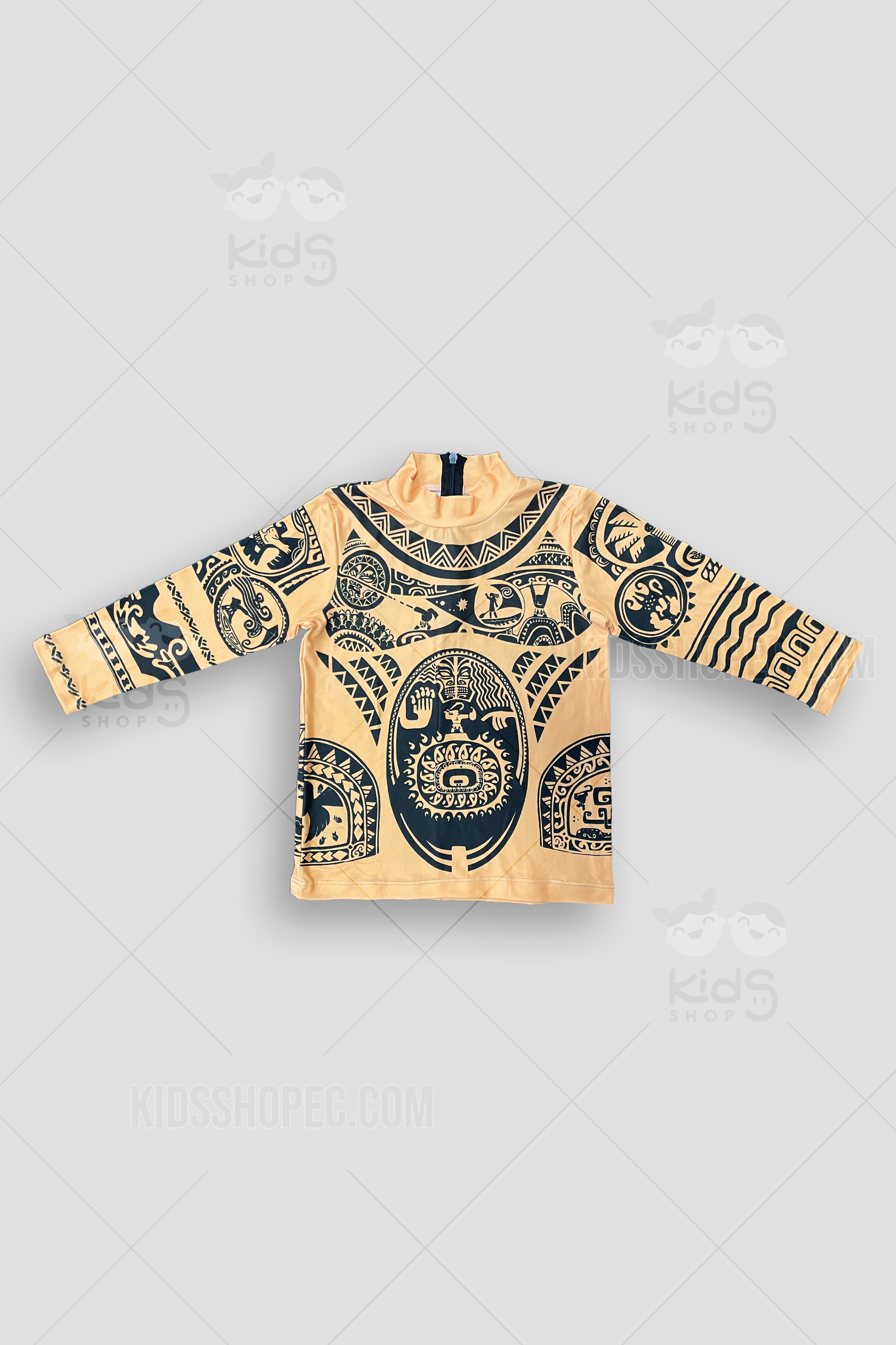 Invoca el poder de los vientos y las olas con este impresionante y detallado disfraz de Maui, el semidiós embaucador y héroe de Moana. Ideal para fiestas de cumpleaños temáticas de Disney, Halloween, juegos de rol de aventura, eventos de cine animado o para vivir emocionantes misiones en la playa. El disfraz principal es un mono de cuerpo completo de color marrón claro, con un estampado de tatuajes polinesios que cubren el torso y los brazos, recreando fielmente el diseño del personaje. La parte inferior del traje es un pantalón o falda de hierba o hojas que le da el toque rústico y tribal. Además, un collar de colmillos de tiburón (o similar) y, en algunas versiones, una peluca de cabello rizado oscuro completan el look. Confeccionado con materiales cómodos y elásticos para permitir total libertad de movimiento mientras tu pequeño semidiós levanta el cielo, controla el viento y protege el corazón de Te Fiti.