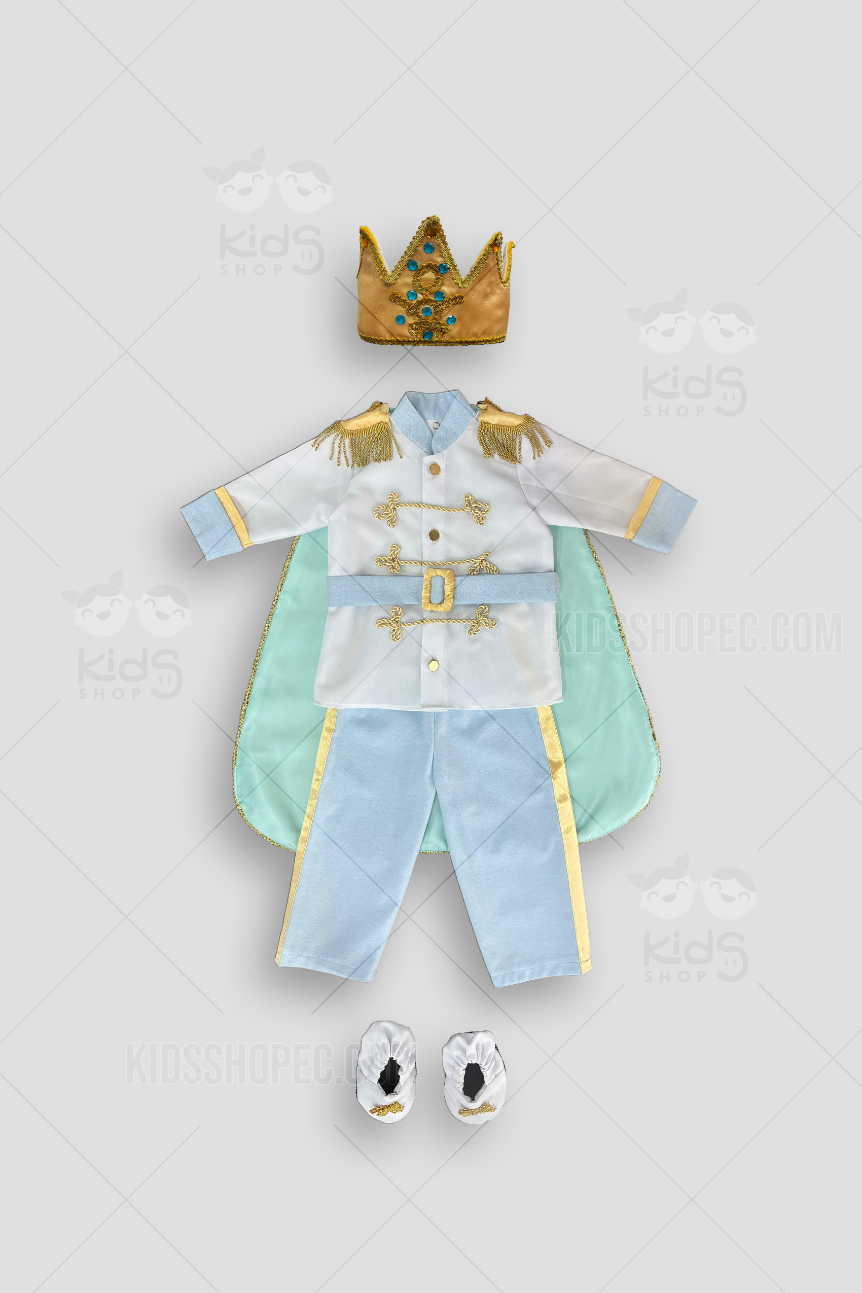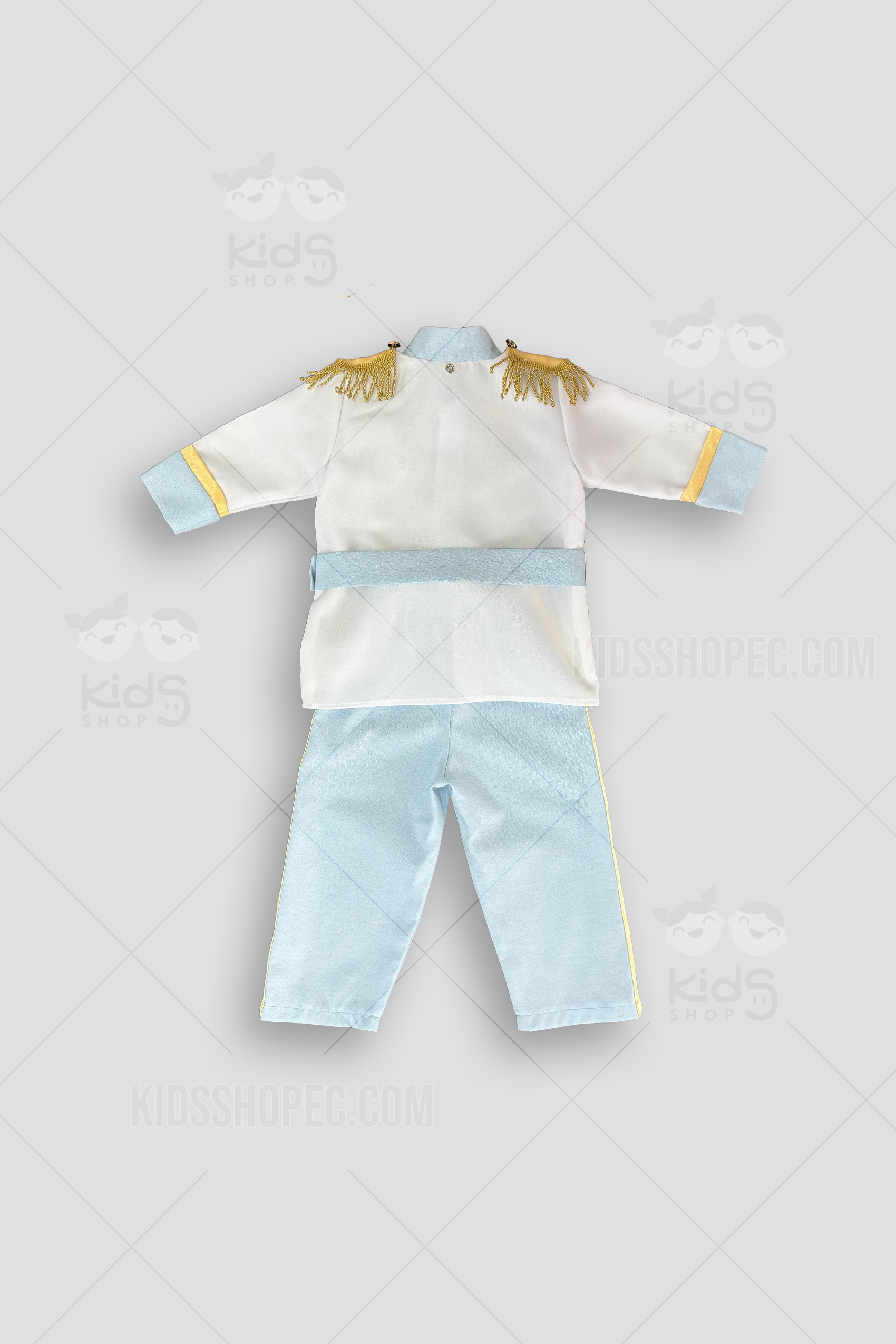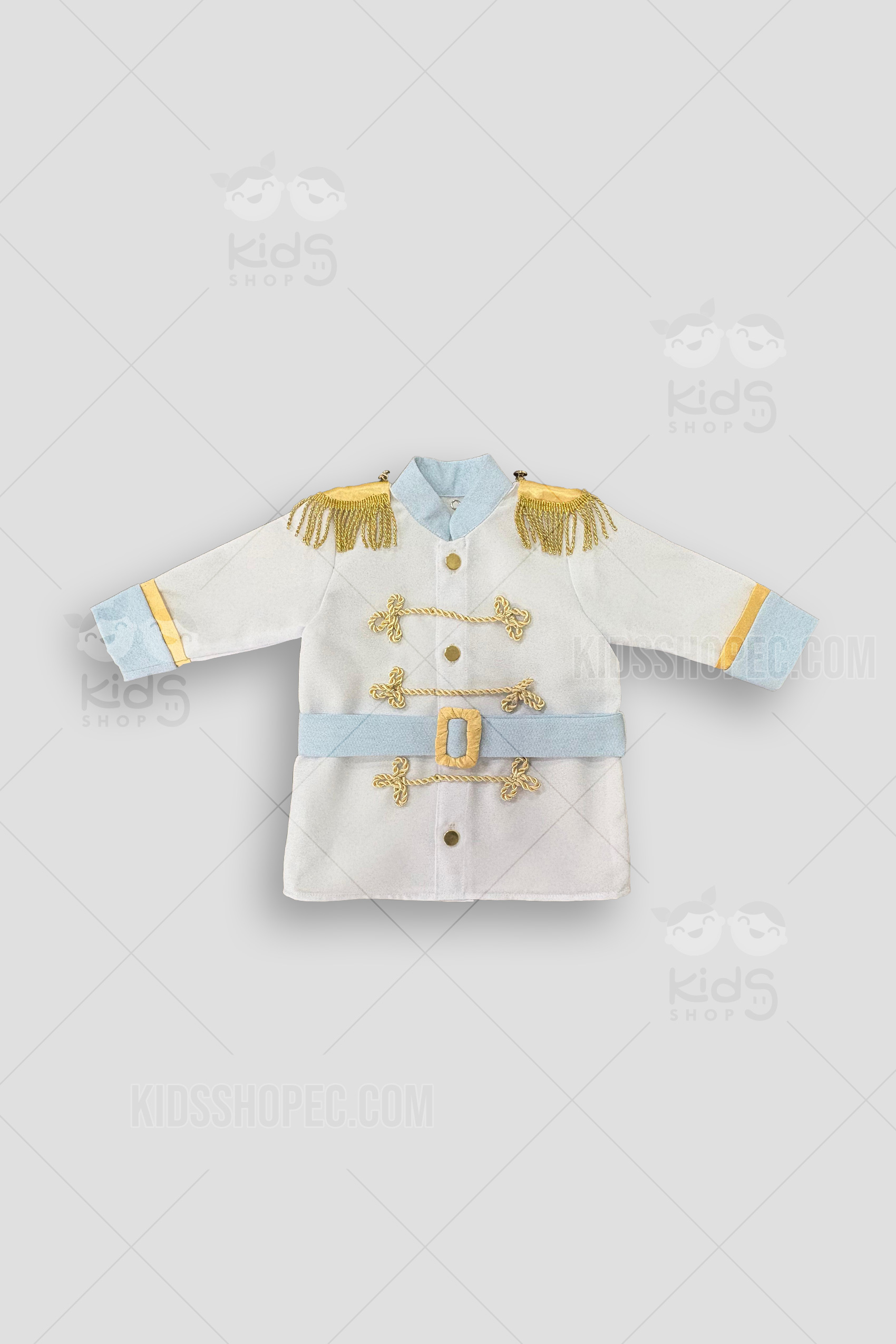 Convierte a tu pequeño en el protagonista de su propio cuento de hadas con este majestuoso y elegante disfraz de príncipe. Ideal para fiestas de cumpleaños temáticas de realeza, obras de teatro escolares, eventos de disfraces, Halloween o simplemente para vivir grandes aventuras en el castillo de la imaginación. El atuendo principal es una chaqueta de gala de color blanco, a menudo con detalles de botones dorados, galones o ribetes que añaden un toque de distinción. Las hombreras, típicamente doradas y con flecos, enfatizan la nobleza del personaje. Se complementa con un pantalón a juego en celeste de un tono claro que evoca los uniformes de gala de la realeza. Un cinturón dorado y una corona de condecoración sumada a la capa que añaden el toque final de autenticidad. Confeccionado con materiales suaves y cómodos para que tu pequeño príncipe pueda bailar, desfilar y salvar el reino sin restricciones.