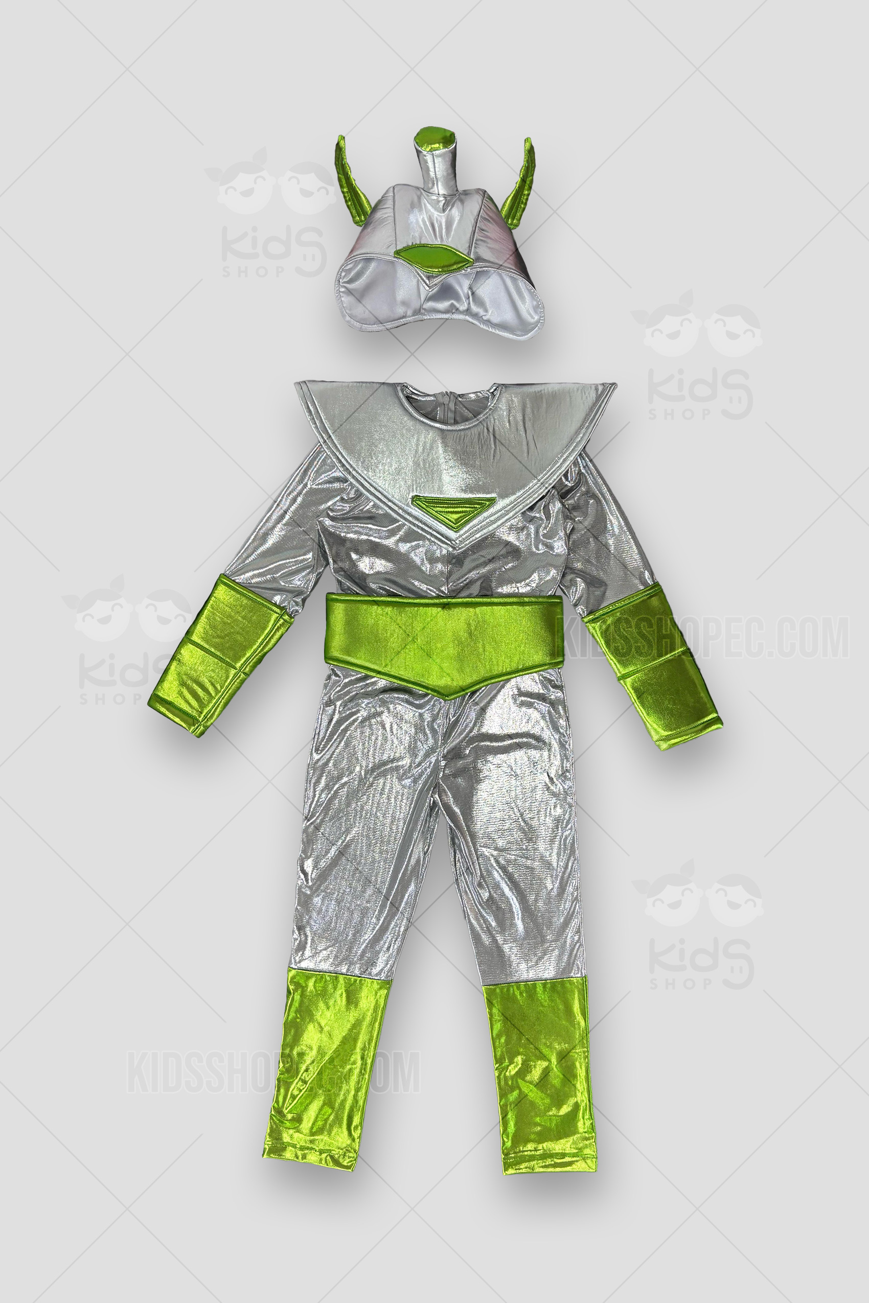 El producto es un llamativo disfraz futurista o de alienígena/guerrero espacial para niño. Consiste en un mameluco de cuerpo completo confeccionado en tela plateada brillante (metálica) que simula una armadura espacial. Este traje se complementa con detalles de contraste en un vibrante color verde lima o neón, visibles en el cuello alto, los puños, las polainas y el cinturón ancho que ciñe la cintura. El vestuario se completa con un casco o tocado plateado con detalles verdes que simulan cuernos, antenas o elementos tecnológicos. Es un atuendo ideal para fiestas temáticas del espacio, ciencia ficción o juegos de rol de astronautas o invasores galácticos.