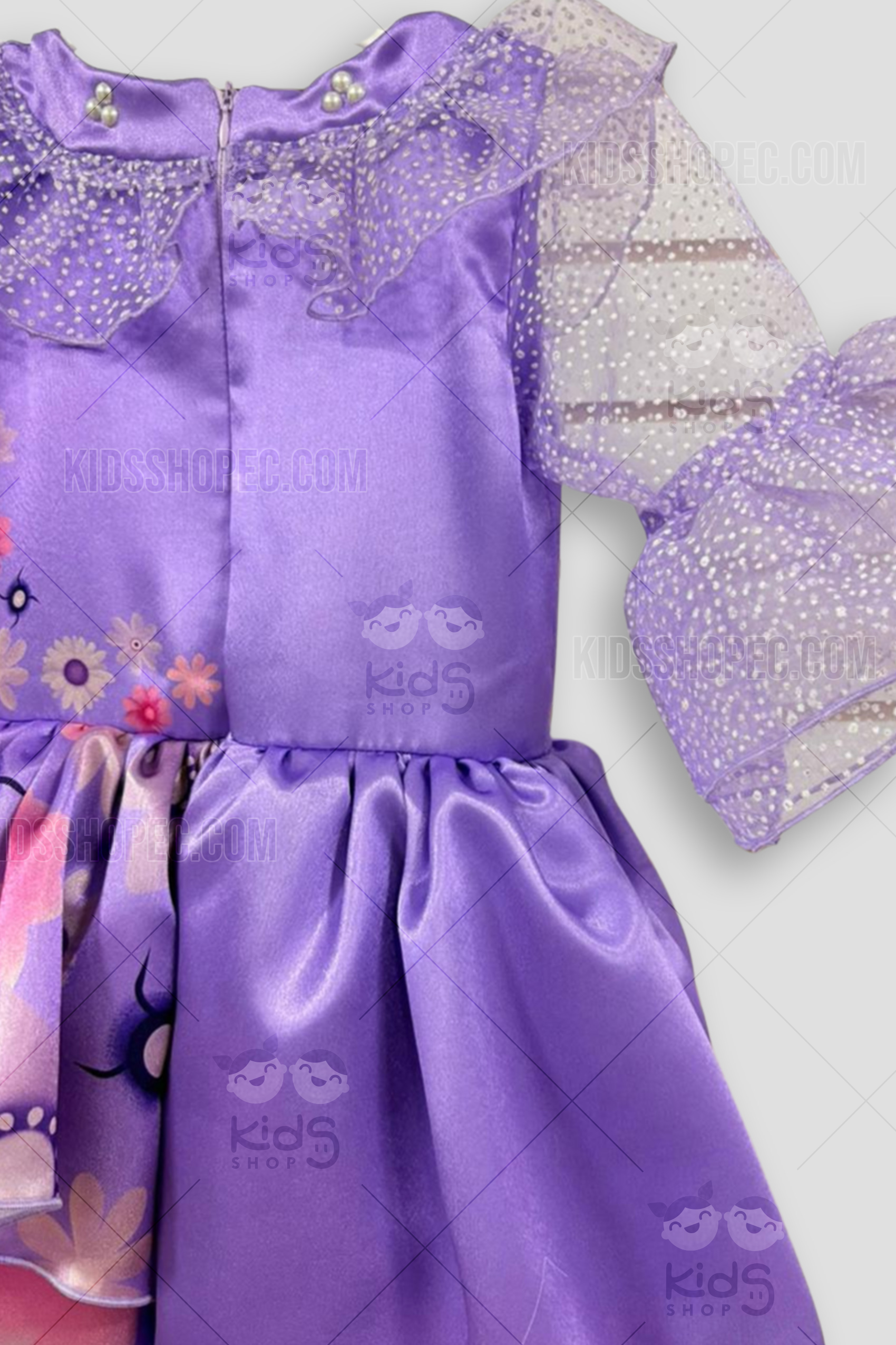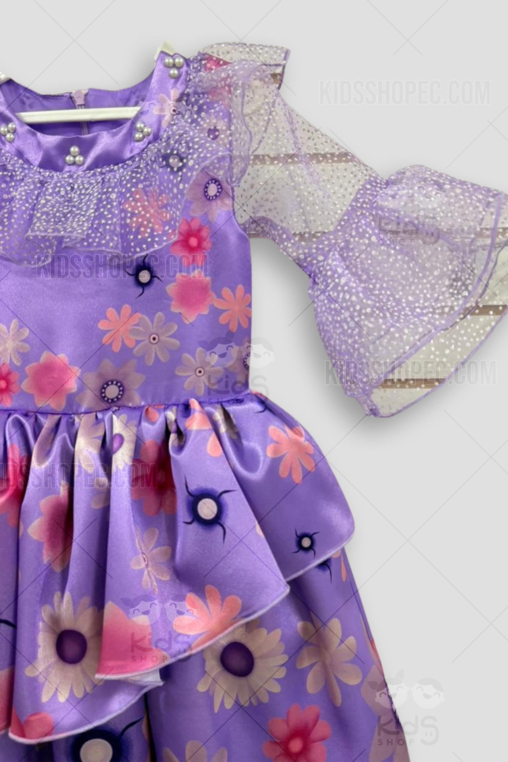 ¡Haz que la magia florezca en casa! Este espectacular Vestido de Isabela Madrigal captura toda la elegancia y perfección del personaje favorito de Encanto. Confeccionado en un hermoso tono lila satinado, el diseño destaca por su estampado vibrante de flores rosas y moradas que recorren todo el traje, tal como en la película. Los detalles son exquisitos: cuenta con un cuello redondo adornado con perlas blancas y un delicado volante de tul con puntos brillantes. Las mangas son el toque final de sofisticación, elaboradas en malla transparente (tipo tul) con volantes amplios que le dan un movimiento etéreo. La falda en capas asimétricas aporta volumen y estilo, perfecta para girar y bailar.