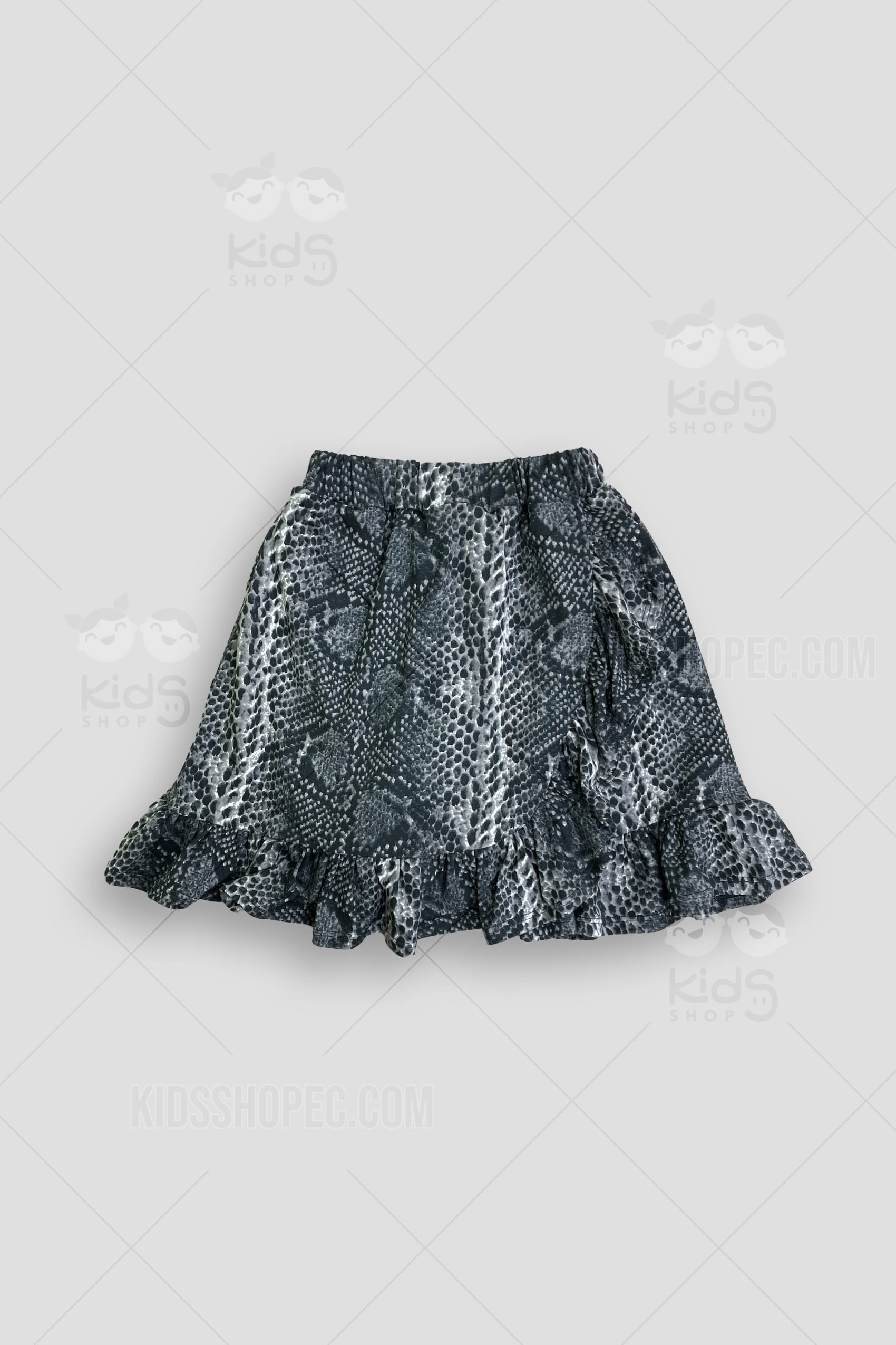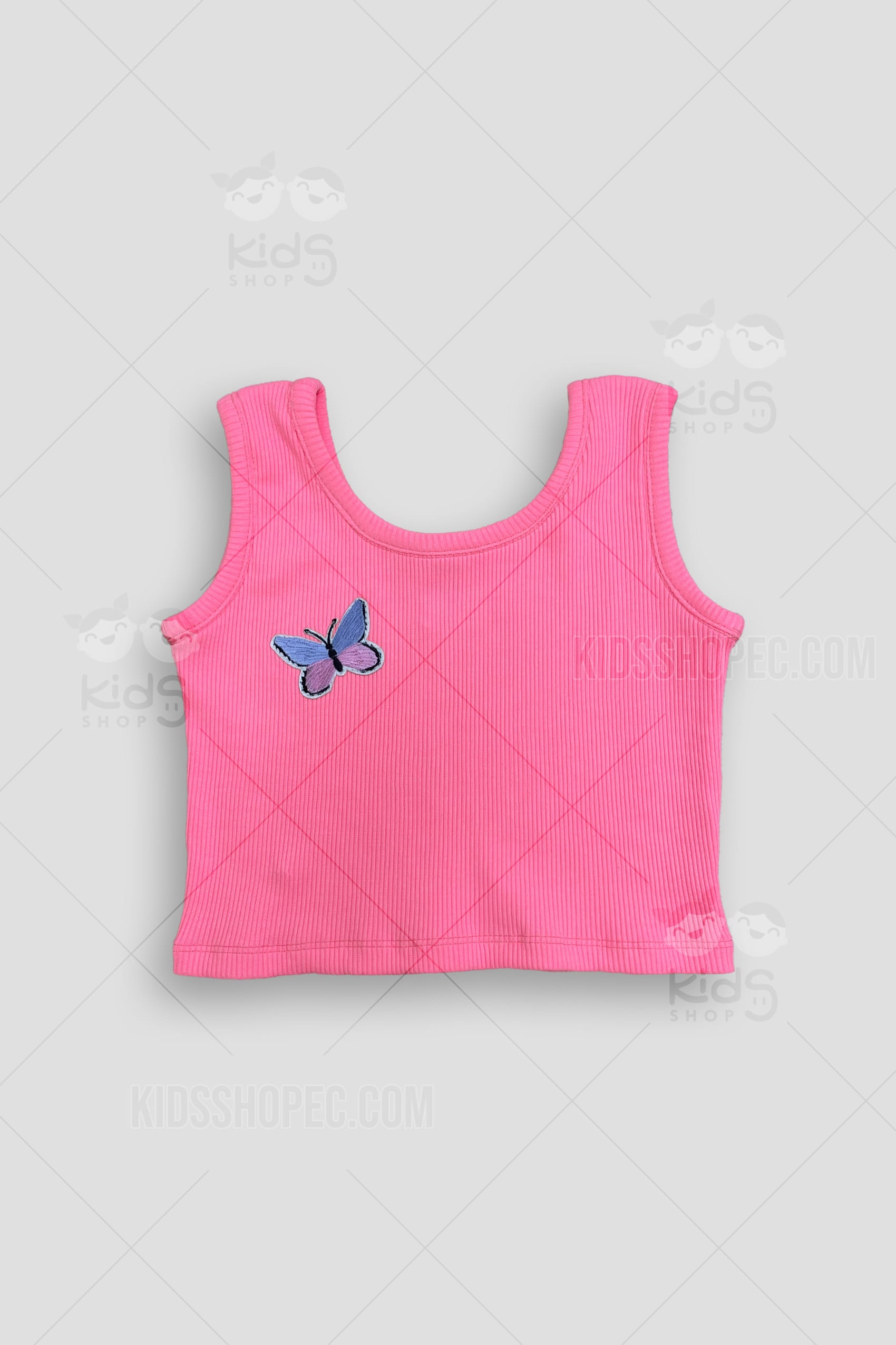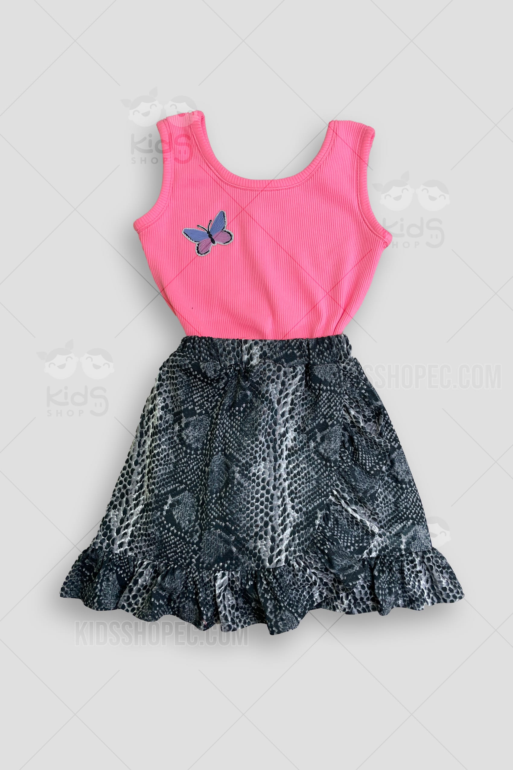 Este conjunto para niña es una opción audaz y moderna, ideal para quienes buscan un estilo diferente. El set incluye un top de tirantes en un vibrante color fucsia con un delicado punto acanalado y un aplique de mariposa azul que le da un toque dulce. Se combina perfectamente con una falda con estampado de piel de serpiente en tonos grises y negros, que le añade un aire chic y a la moda. La falda tiene un detalle de volante en el dobladillo para un movimiento suave. Esta combinación de texturas y colores hace que sea una prenda versátil para cualquier ocasión.